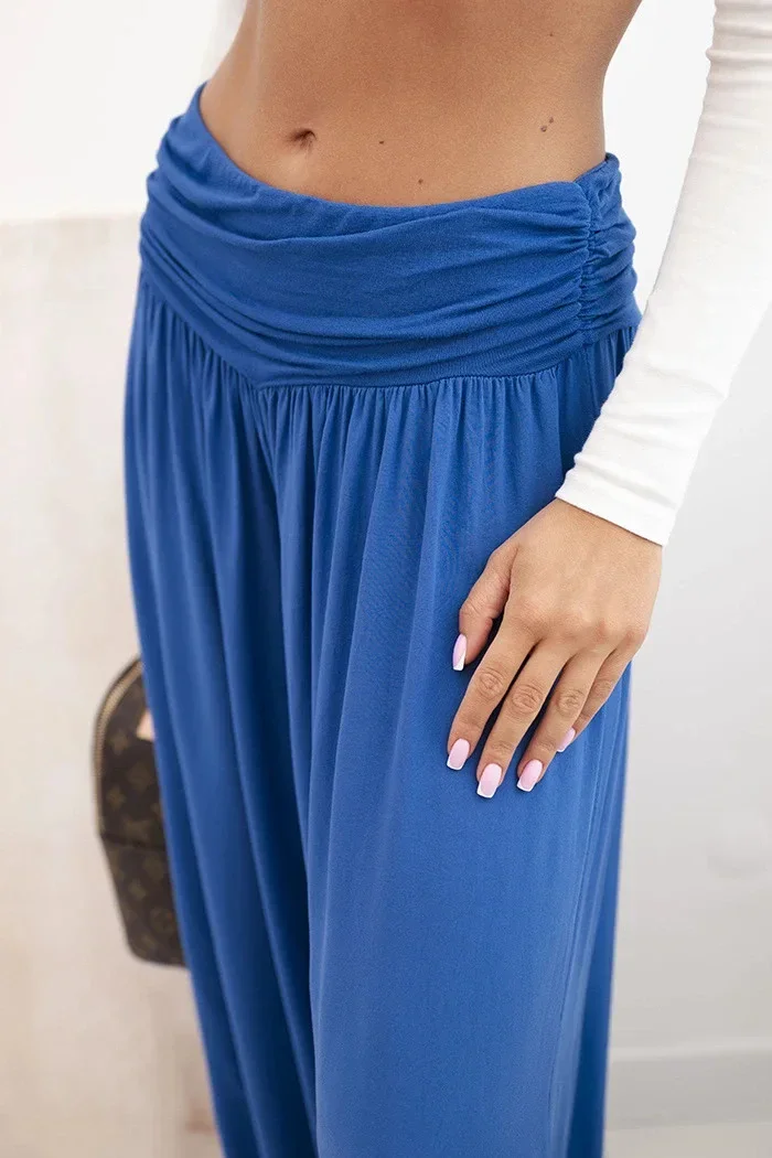 Dámské viskózové kalhoty s širokými nohavicemi a volánky chrpově modrá