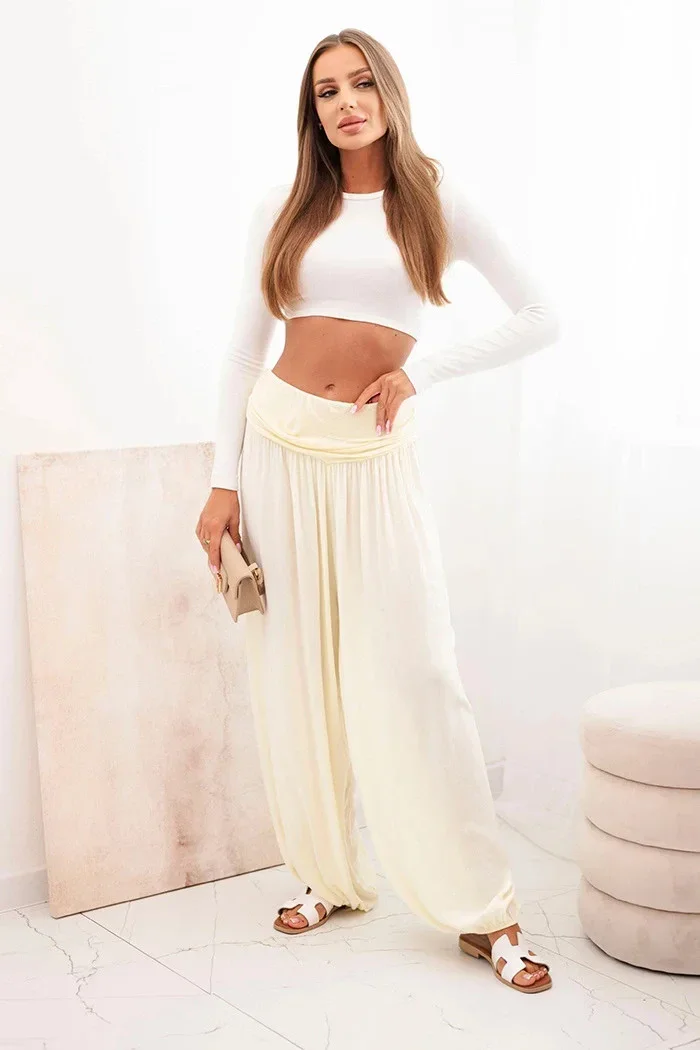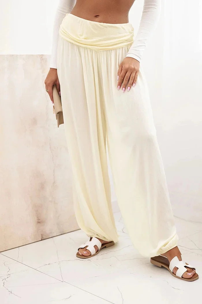 Tyto výjimečné dámské kalhoty se širokými nohavicemi a jemnými řaseními jsou ideální volbou pro každodenní nošení i jiné příležitosti. Vyrobené ze 100% měkké viskózy zajišťují lehkost a pohodlí i v teplejších dnech. Elastický pas poskytuje komfort a perfektní přizpůsobení, zatímco volný střih umožňuje volnost pohybu a moderní vzhled. Model zakončený gumičkou na spodní části nohavic dodává kalhotám jedinečný charakter a jemně zvýrazňuje postavu. Skvělá volba na procházku, nákupy, výlet nebo odpočinek v domácím pohodlí. Díky jednoduchému střihu a neutrálním barvám je snadno sladíte s různými styly – od sportovních po ležérní. Velikost je univerzální a bude vyhovovat ženám velikosti S, M nebo L.