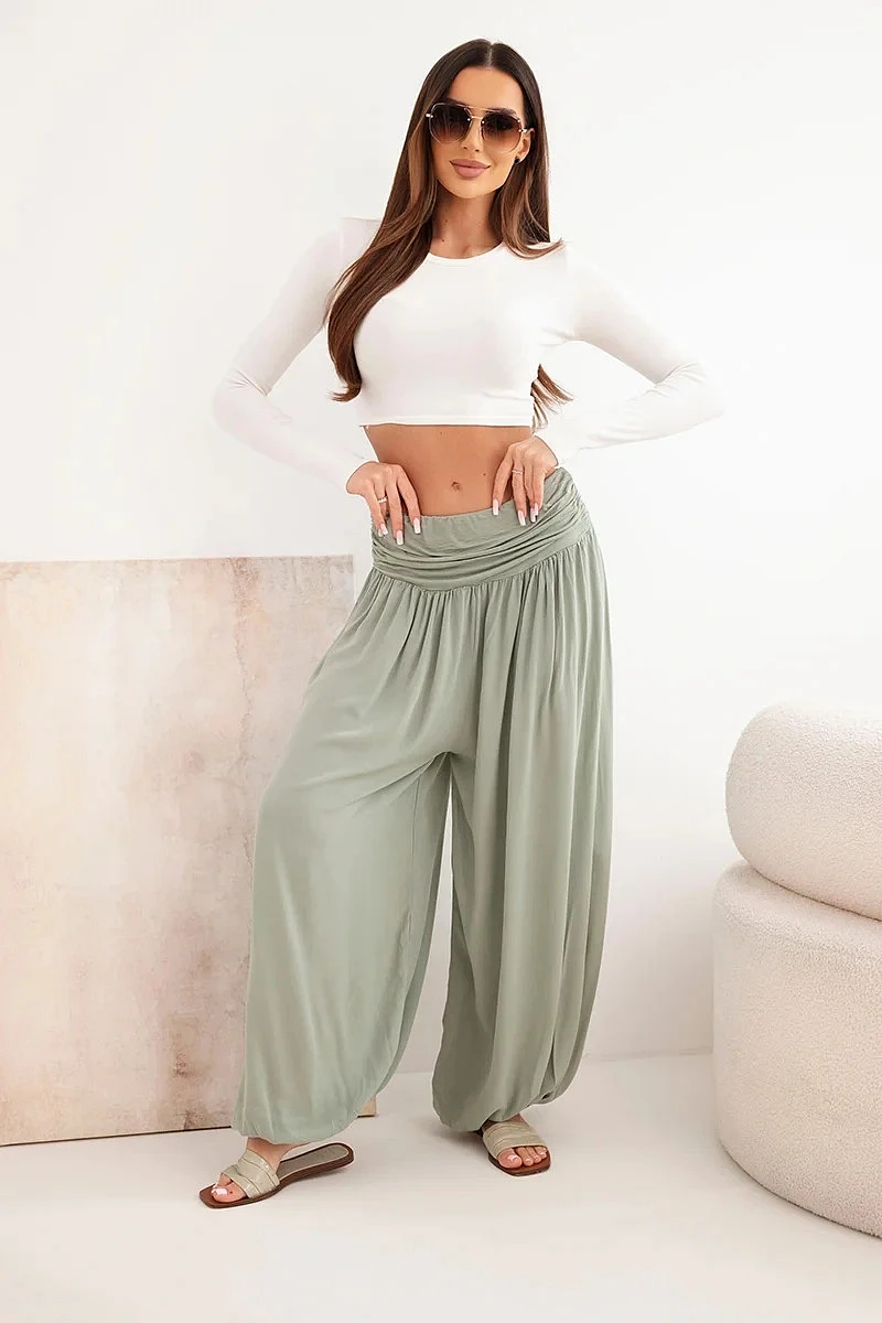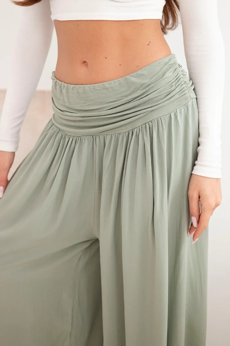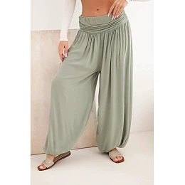 Dámské viskózové kalhoty se širokou nohavicí a řasením khaki