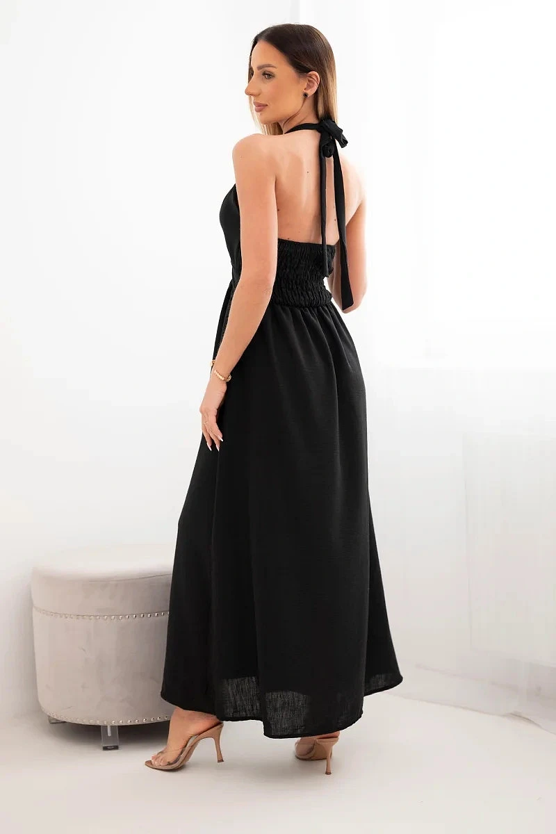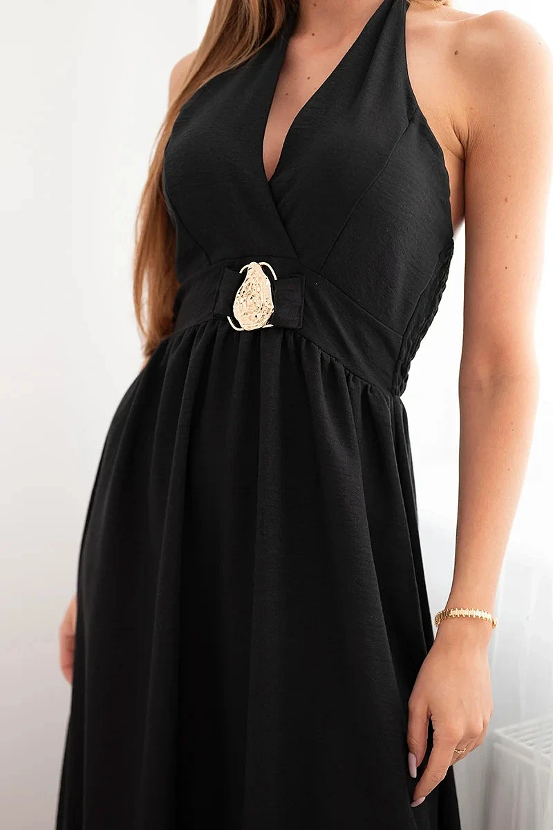 Dámské viskózové maxi šaty vázané na krku s ozdobnou sponou černá