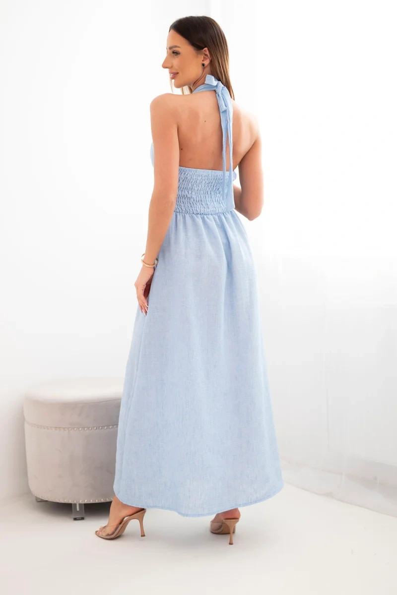 Dámské viskózové maxi šaty vázané u krku s ozdobnou sponou modrá
