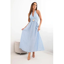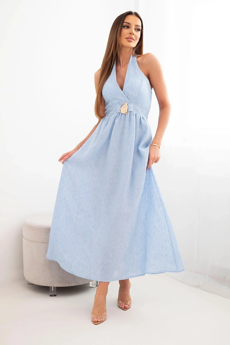 Dámské viskózové maxi šaty vázané u krku s ozdobnou sponou modrá
