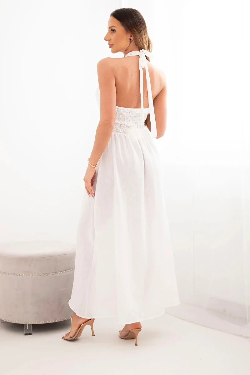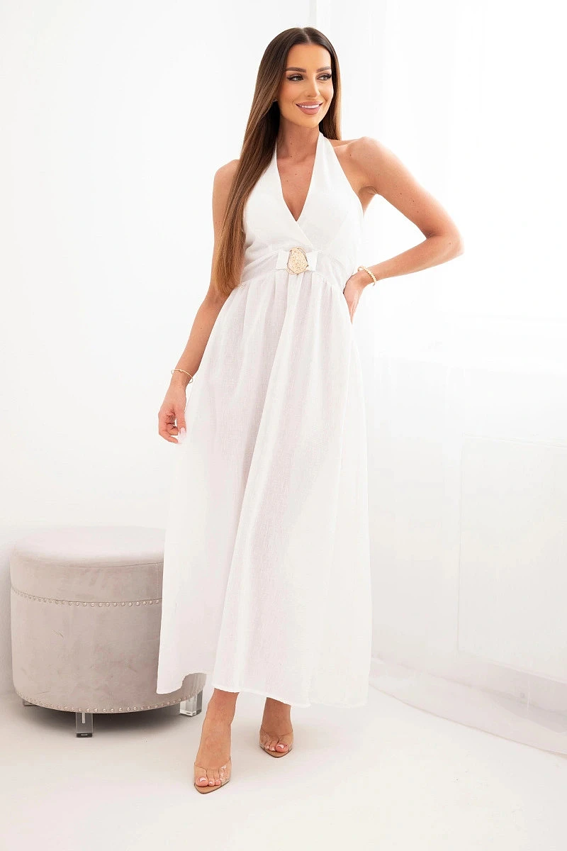 Dámské viskózové maxi šaty vázané za krk s ozdobnou přezkou ecru