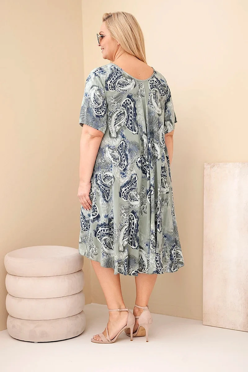 Šaty mají klasický zaoblený výstřih a krátké rukávy, které zajišťují lehkost a prodyšnost. Originální paisley vzor dodává celku módní a výjimečný charakter, díky čemuž model upoutá pozornost a vyniká ve stylizacích. Rozšířený spodní díl zajišťuje, že šaty krásně padnou a poskytují pocit volnosti pohybu.