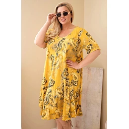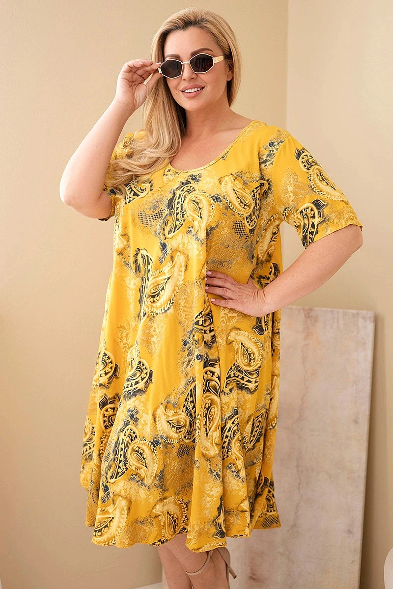 Dámské viskózové šaty Plus Size s krátkým rukávem a paisley střihem hořčicová