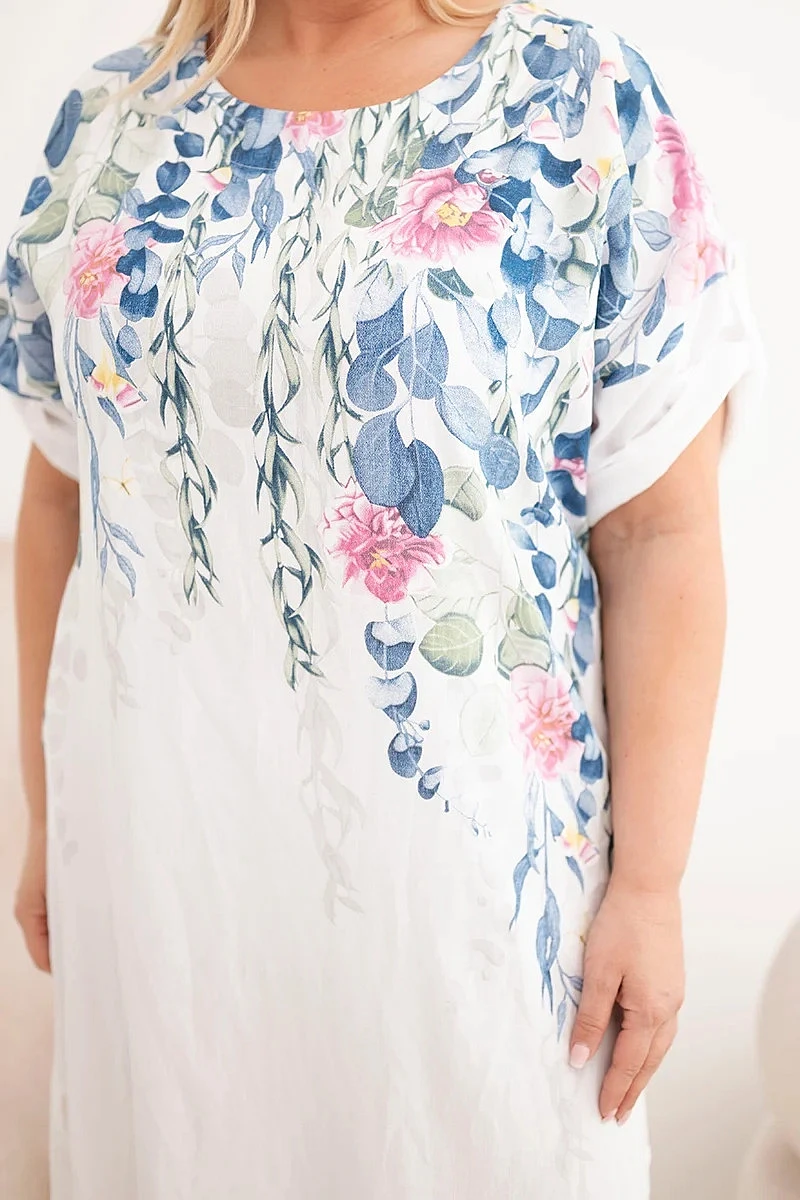 Dámské šaty plus size s krátkým rukávem jsou vynikající volbou pro ženy, které hledají pohodlné a zároveň stylové oblečení na každý den. Model se vyznačuje jemným rostlinným vzorem v horní části, který přidává celku lehkost a ženské kouzlo. Volný střih zajišťuje, že šaty dobře padnou na postavu a poskytují pohodlí při nošení po celý den.