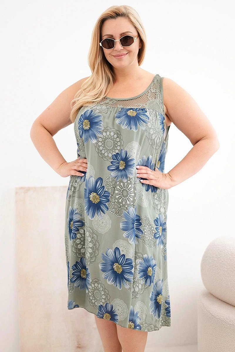 Dámské viskózové šaty Plus Size s květinovým vzorem a krajkovým výstřihem khaki