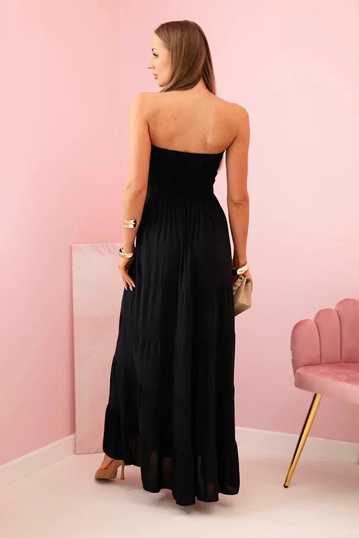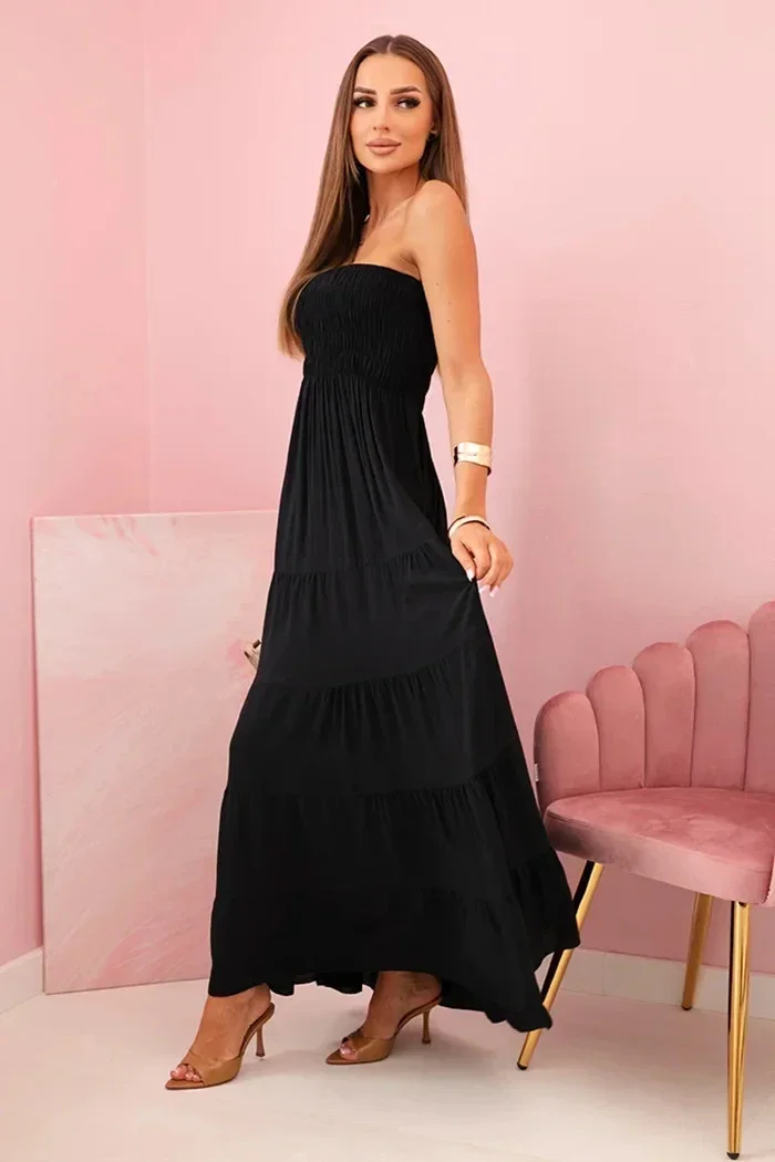 Tato dámská maxi šaty jsou ideální volbou na teplejší dny – okouzlují lehkostí, ženským střihem a pohodlím při nošení. Díky elastickému, nařasenému hornímu dílu se krásně přizpůsobí postavě, zvýrazní pas a poprsí, a rozšířený spodní díl dodává celku lehkost a volnost. Ušité ze 100% prodyšné viskózy zajišťují pohodlí po celý den – ať už si je vyberete na procházku, dovolenou nebo setkání s přáteli. Model je velmi ženský a univerzální – skvěle vypadá samostatně i v kombinaci s džínovou bundou nebo sandály. Jemné řasení dodává šatům kouzlo a zajišťuje efektní vzhled. Velikost je univerzální a bude vhodná pro ženy velikosti S, M nebo L.