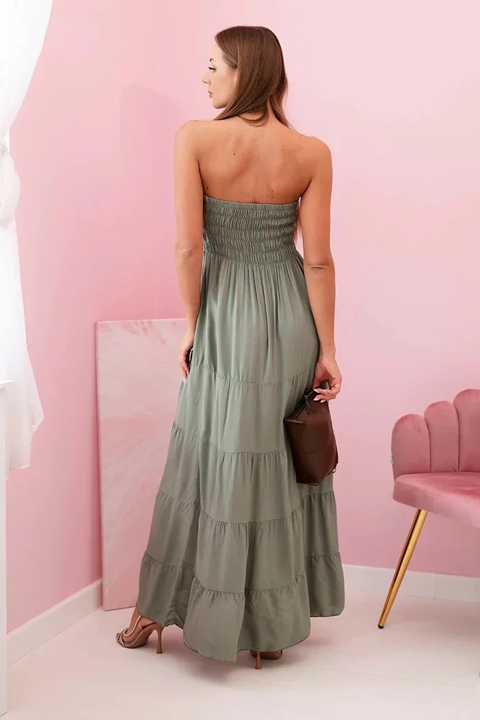 Tato dámská maxi šaty jsou ideální volbou na teplejší dny – okouzlují lehkostí, ženským střihem a pohodlím při nošení. Díky elastickému, nařasenému hornímu dílu se krásně přizpůsobí postavě, zvýrazní pas a poprsí, a rozšířený spodní díl dodává celku lehkost a volnost. Ušité ze 100% prodyšné viskózy zajišťují pohodlí po celý den – ať už si je vyberete na procházku, dovolenou nebo setkání s přáteli. Model je velmi ženský a univerzální – skvěle vypadá samostatně i v kombinaci s džínovou bundou nebo sandály. Jemné řasení dodává šatům kouzlo a zajišťuje efektní vzhled. Velikost je univerzální a bude vhodná pro ženy velikosti S, M nebo L.