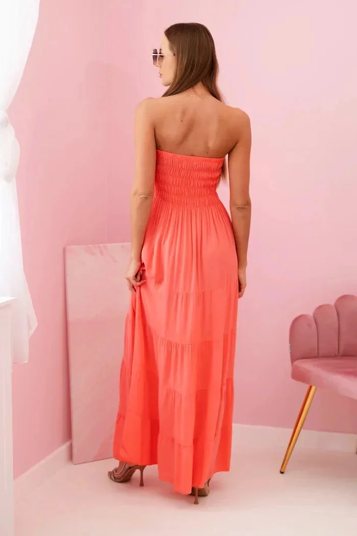 Tato dámská maxi šaty jsou ideální volbou na teplejší dny – okouzlují lehkostí, ženským střihem a pohodlím při nošení. Díky elastickému, nařasenému hornímu dílu se krásně přizpůsobí postavě, zvýrazní pas a poprsí, a rozšířený spodní díl dodává celku lehkost a volnost. Ušité ze 100% prodyšné viskózy zajišťují pohodlí po celý den – ať už si je vyberete na procházku, dovolenou nebo setkání s přáteli. Model je velmi ženský a univerzální – skvěle vypadá samostatně i v kombinaci s džínovou bundou nebo sandály. Jemné řasení dodává šatům kouzlo a zajišťuje efektní vzhled. Velikost je univerzální a bude vhodná pro ženy velikosti S, M nebo L.