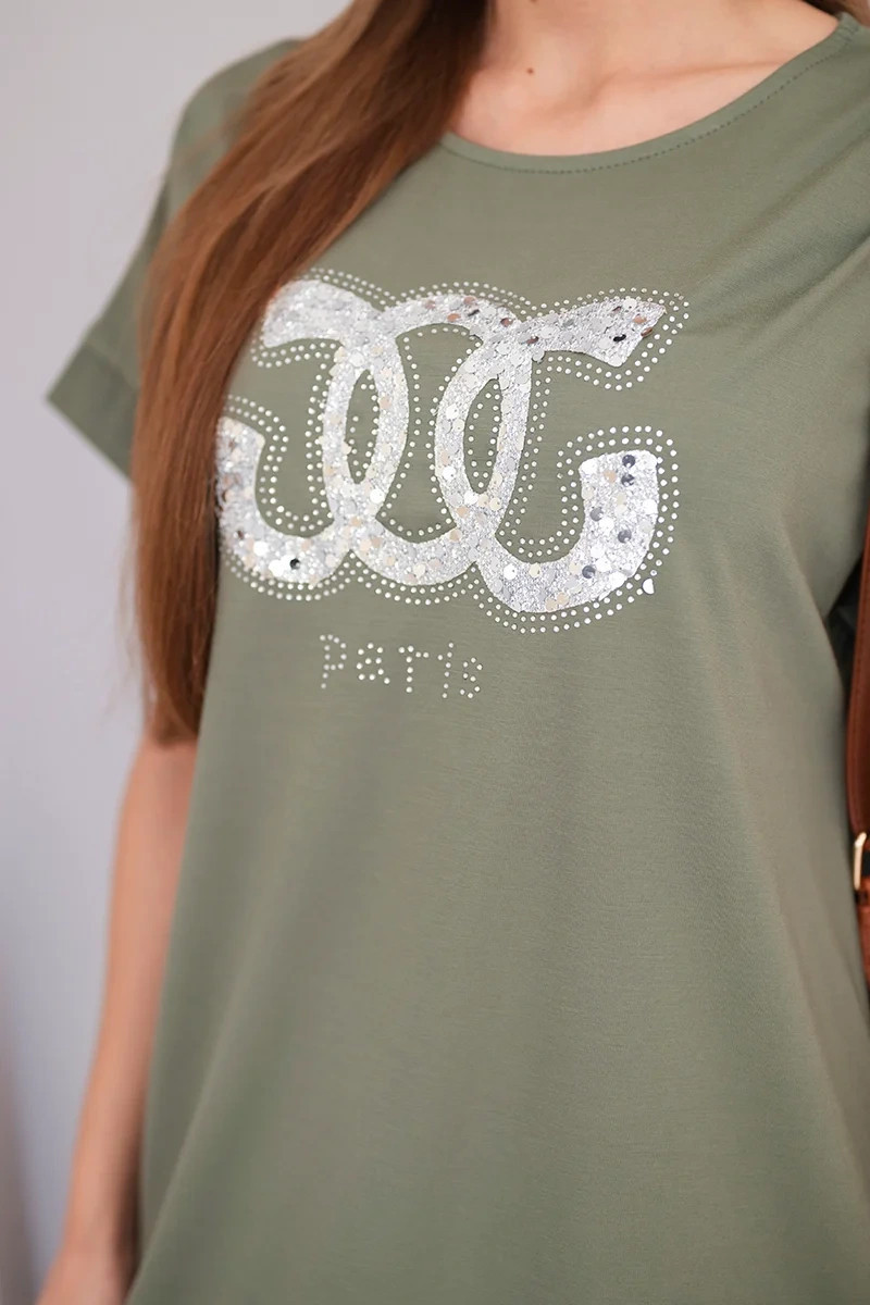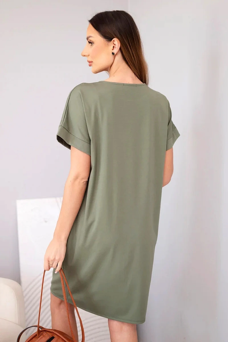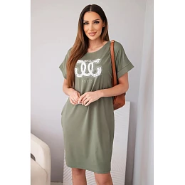 Dámské viskózové šaty s krátkým rukávem a ozdobným potiskem khaki