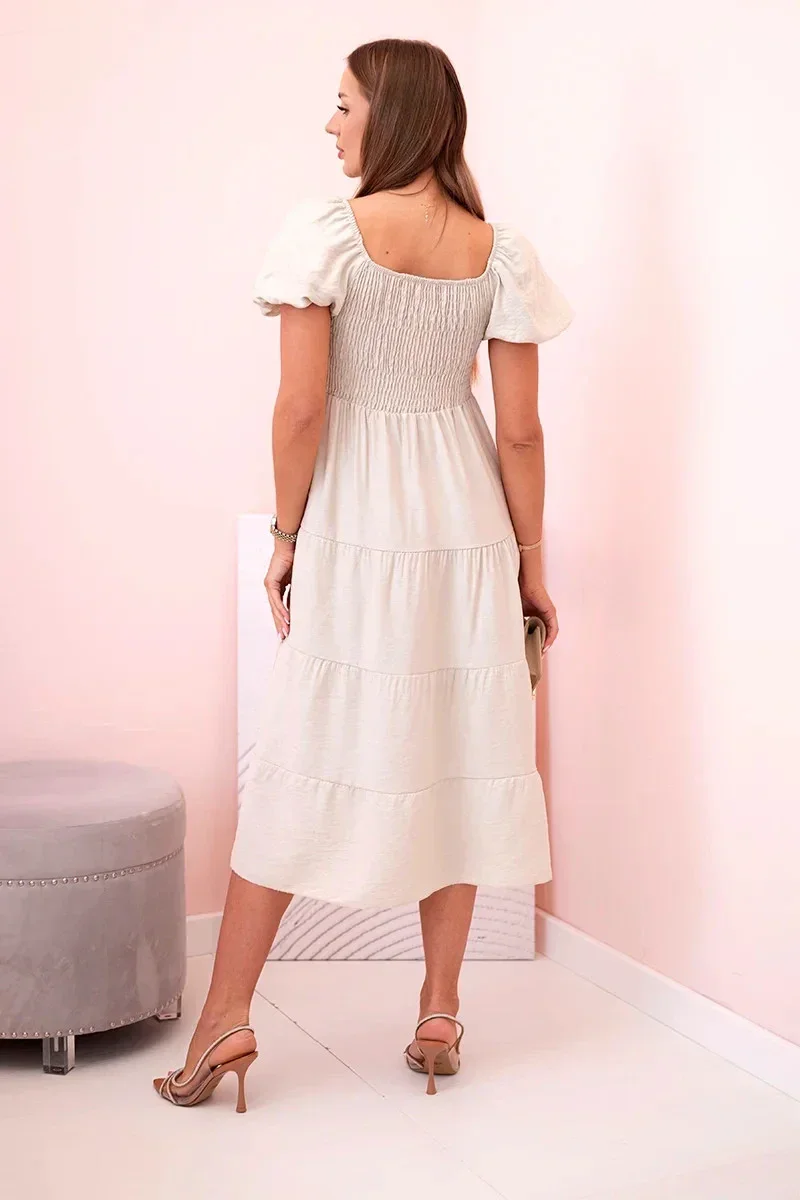 Dámské viskózové šaty s nabíranými rukávy a volánkovým topem béžový