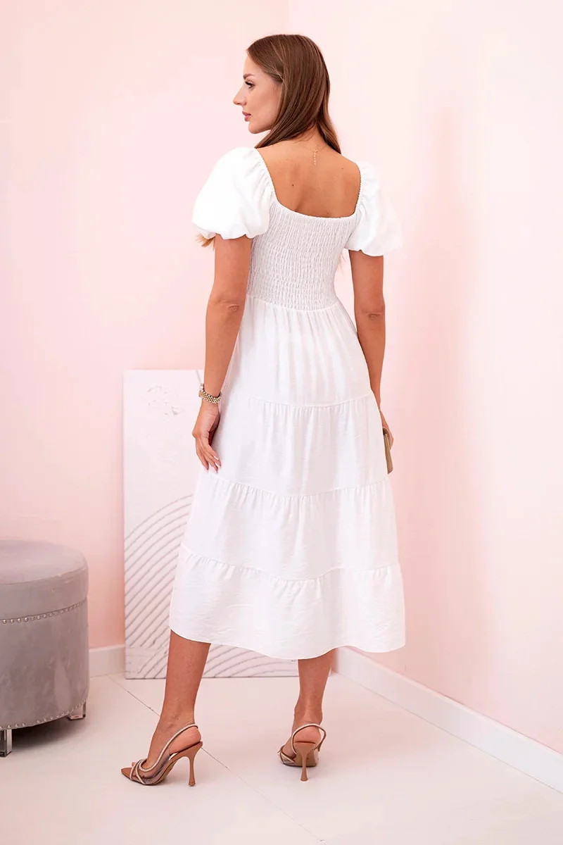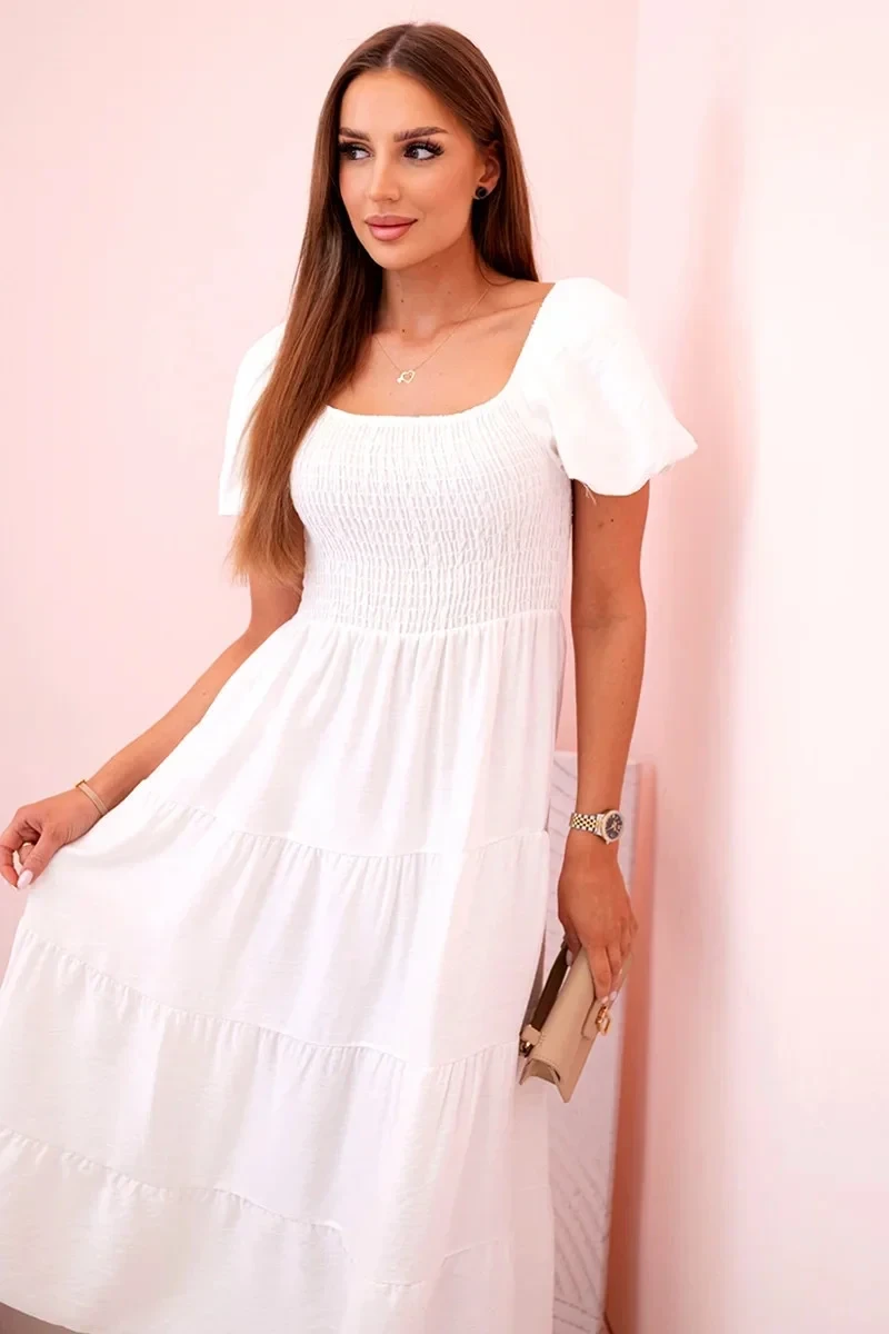 Dámské viskózové šaty s nabíranými rukávy a volánkovým topem ecru