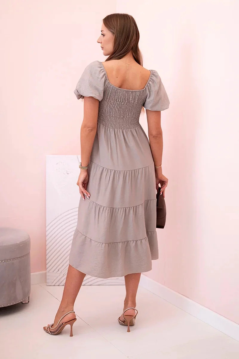 Tato roztomilá dámská šaty s nafouknutými rukávy je ideální volbou na teplé letní dny. Lehký, vzdušný materiál v kombinaci s elastickým, nabíraným horním dílem zajišťuje pohodlí a perfektní přizpůsobení postavě. Šaty mají ženský čtvercový výstřih a midi délku, která je skvělá jak na běžné nošení, tak na dovolené procházky, rodinné setkání nebo letní večírky. Rozšířený spodní díl se krásně pohybuje při chůzi a dodává postavě lehkost a jemný půvab. Je to skvělá volba pro ženy, které si cení pohodlí, romantického stylu a univerzálních střihů. Díky elastickému hornímu dílu se přizpůsobí různým typům postavy a krásně zvýrazní pas a ramena. Velikost je univerzální a vhodná pro dámy velikosti S, M nebo L.