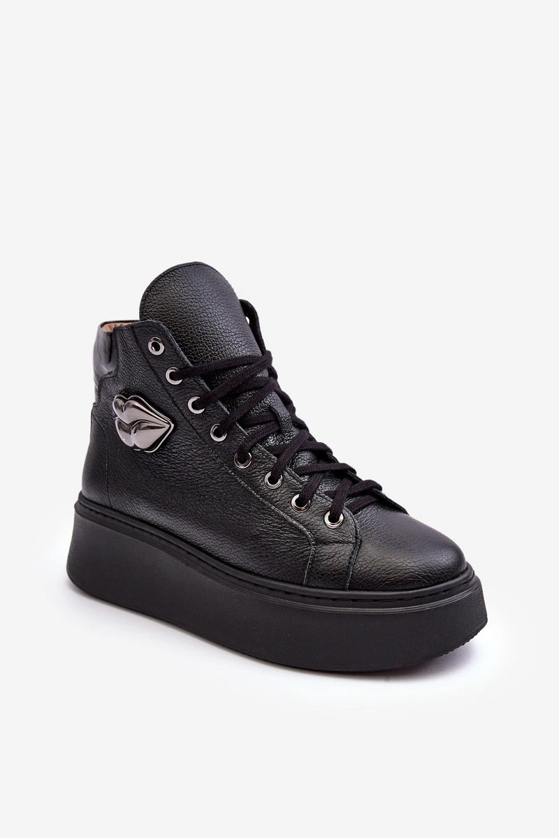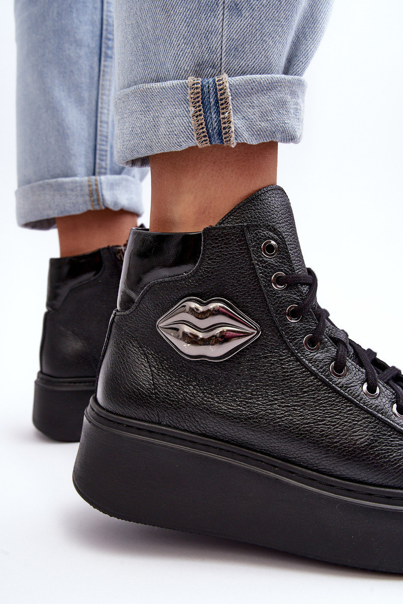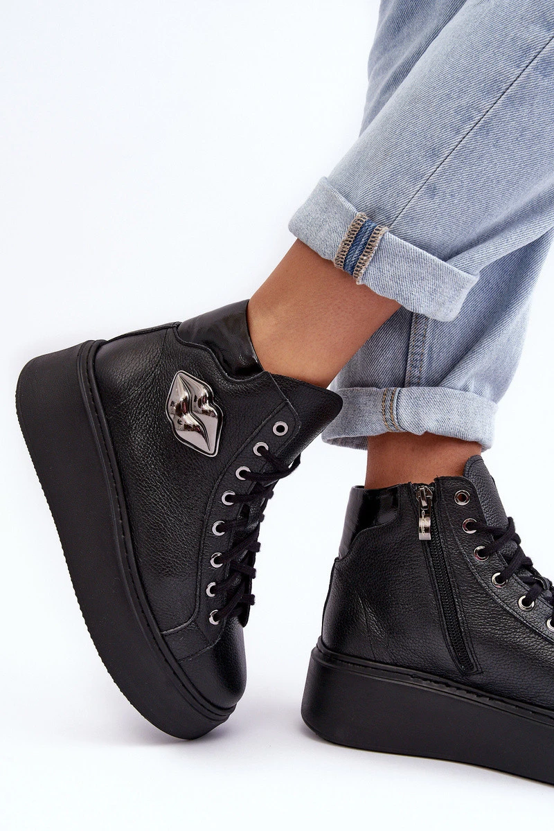 Tyto dámské vysoké tenisky jsou vyrobeny z přírodní kůže. Mají šněrování a zip na straně kotníku. Tento pohodlný model je umístěn na masivní platformě. Vložka je také vyrobena z přírodní kůže. Klasický vzor, pohodlný střih a módní ozdoba dělají z těchto tenisek něco výjimečného! Při výběru velikosti se řiďte tabulkou velikostí.