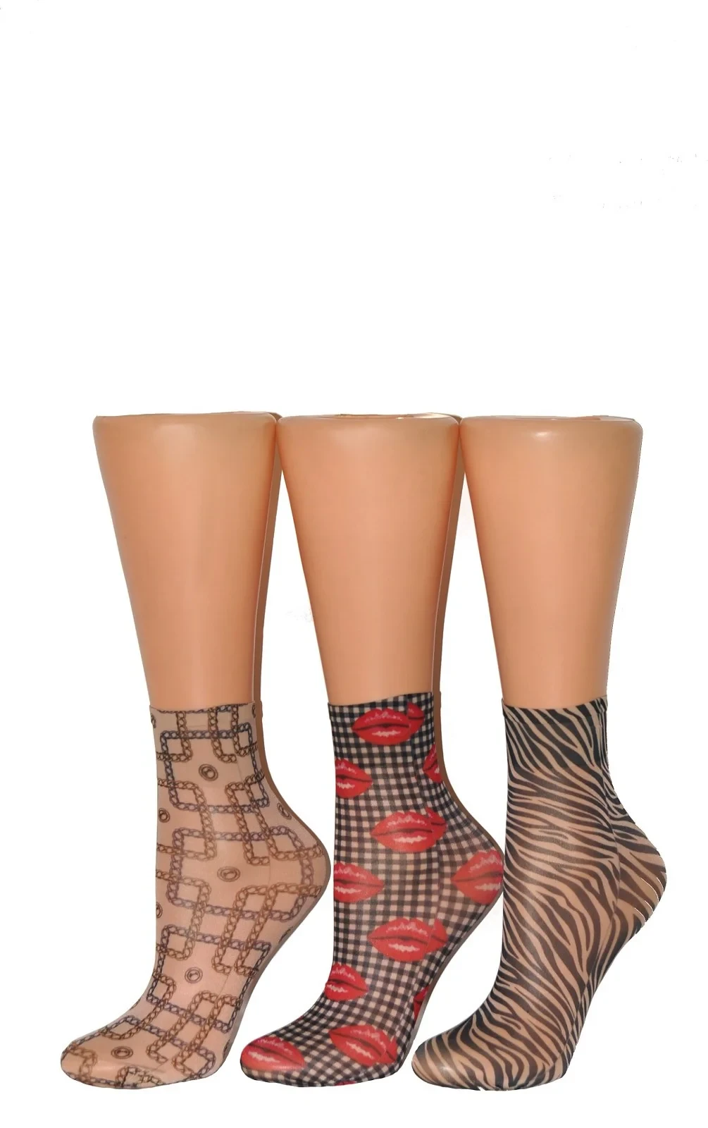Model má lem, který při nošení netlačí. Ponožky jsou ozdobené různými vzory: květinovými, gepardími, károvanými, puntíkovanými, se srdíčky.