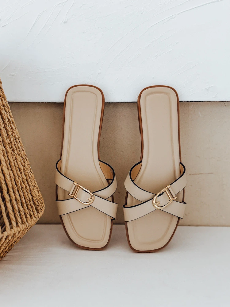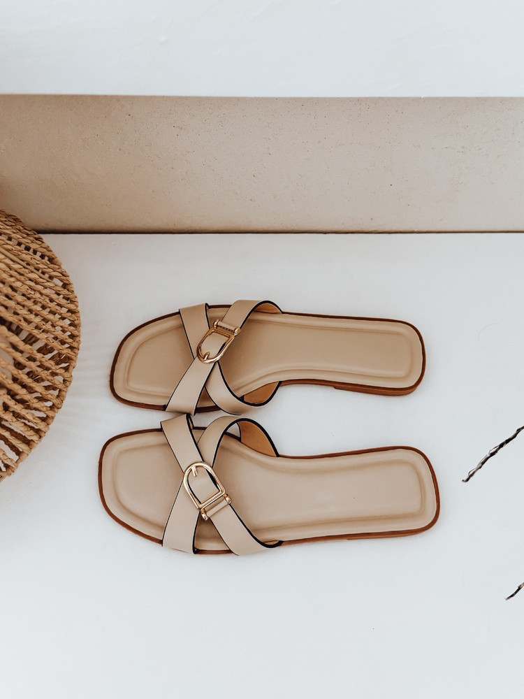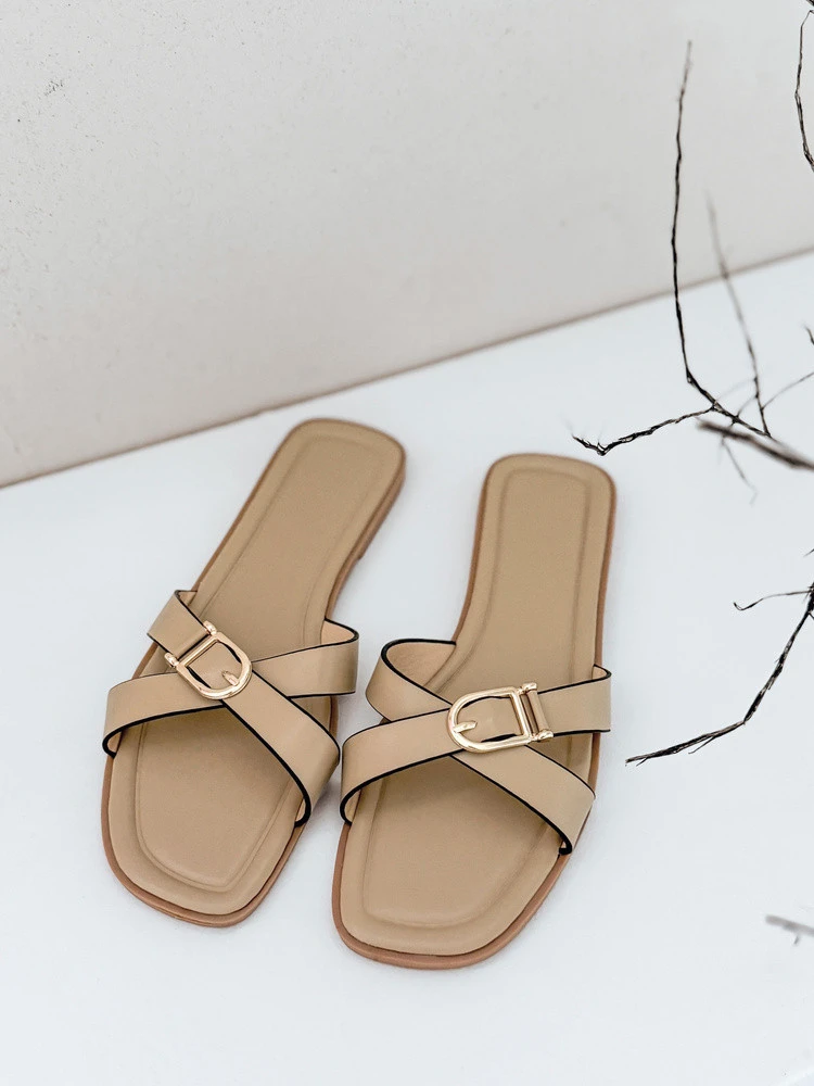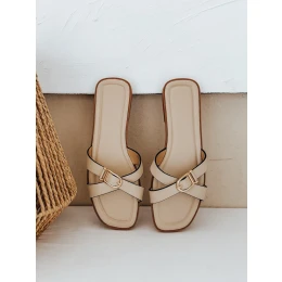 Klapki damskie wykonane z wysokiej jakości skóry ekologicznej, z dekoracyjną klamrą i krzyżującymi się paskami. Stylowy design i uniwersalny charakter sprawiają, że idealnie komponują się zarówno z sukienką, jak i jeansami. Lekkie, wygodne i modne – świetne na wiosenne dni.