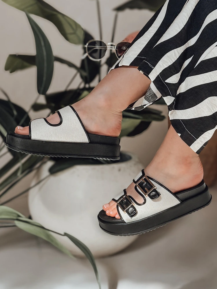 Stylové žabky na 4 cm vysoké podrážce s ozdobnými přezkami jsou dokonalou kombinací pohodlí a elegance. Jsou vyrobeny z vysoce kvalitní tkaniny a dokonale přiléhají k noze. Silná podrážka jim dodává charakter a zajišťuje celodenní pohodlí při nošení. Žabky jsou ideální pro mnoho stylizací do teplých letních dnů.
