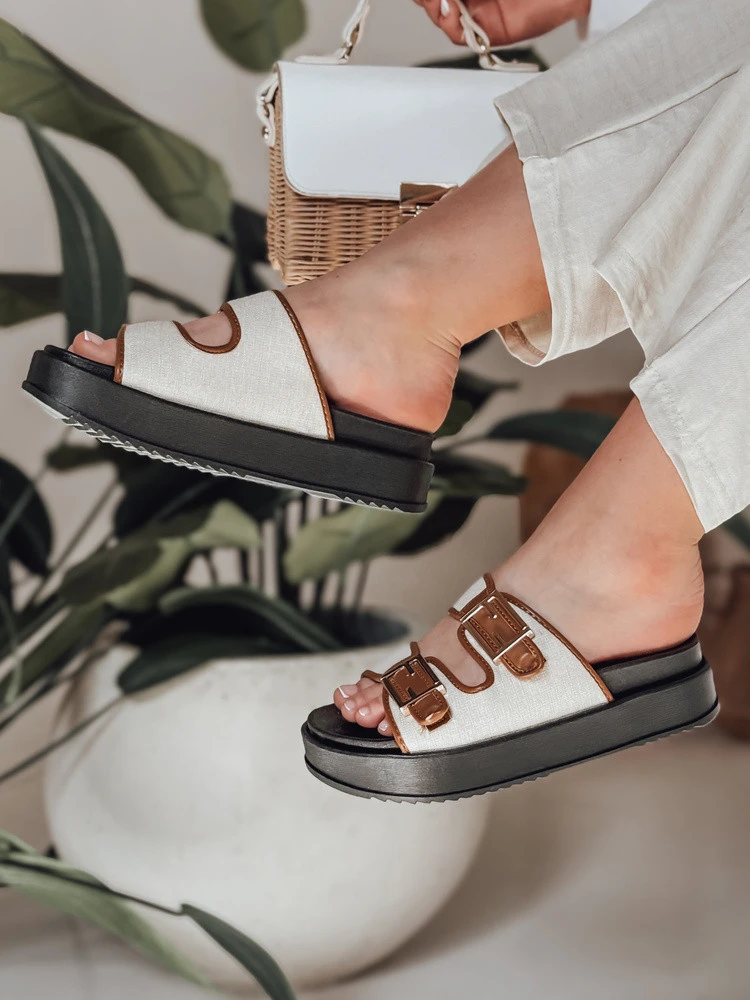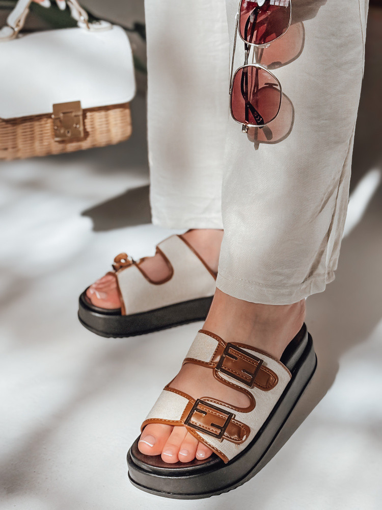 Stylové žabky na 4 cm vysoké podrážce s ozdobnými přezkami jsou dokonalou kombinací pohodlí a elegance. Jsou vyrobeny z vysoce kvalitní tkaniny a dokonale přiléhají k noze. Silná podrážka jim dodává charakter a zajišťuje celodenní pohodlí při nošení. Žabky jsou ideální pro mnoho stylizací do teplých letních dnů.