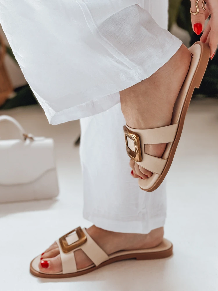 Dámské žabky z ekologické kůže s elegantním střihem a ozdobnými zlatými přezkami jsou nadčasovým doplňkem pro teplé dny. Pohodlná plochá podrážka a klasický střih se budou dobře hodit k ležérním i elegantnějším letním outfitům.