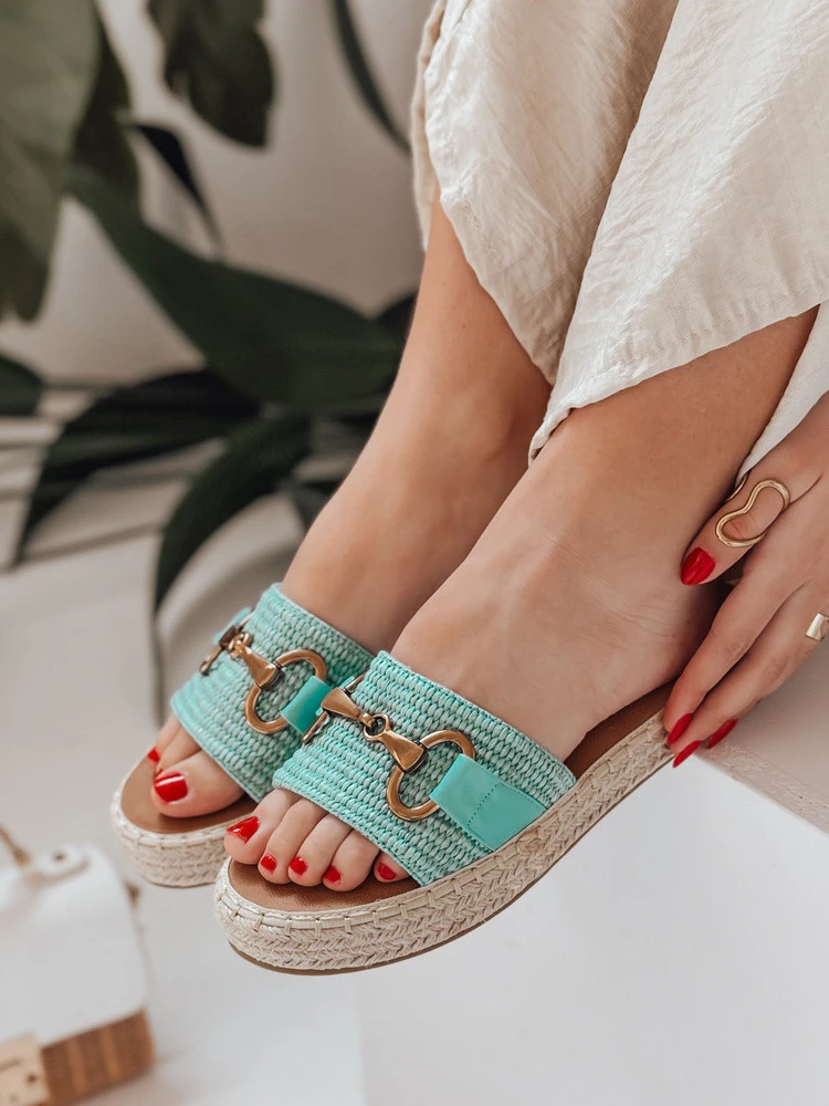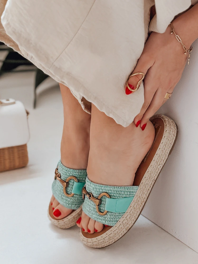 Módní dámské žabky s výraznými zlatými akcenty a pletenou platformou tvoří letní must-have. Široký pásek zaručuje pohodlí a stabilitu. Jsou ideální volbou pro každodenní styling v horkých dnech - ideální do města i na dovolenou.