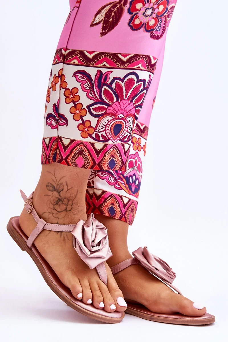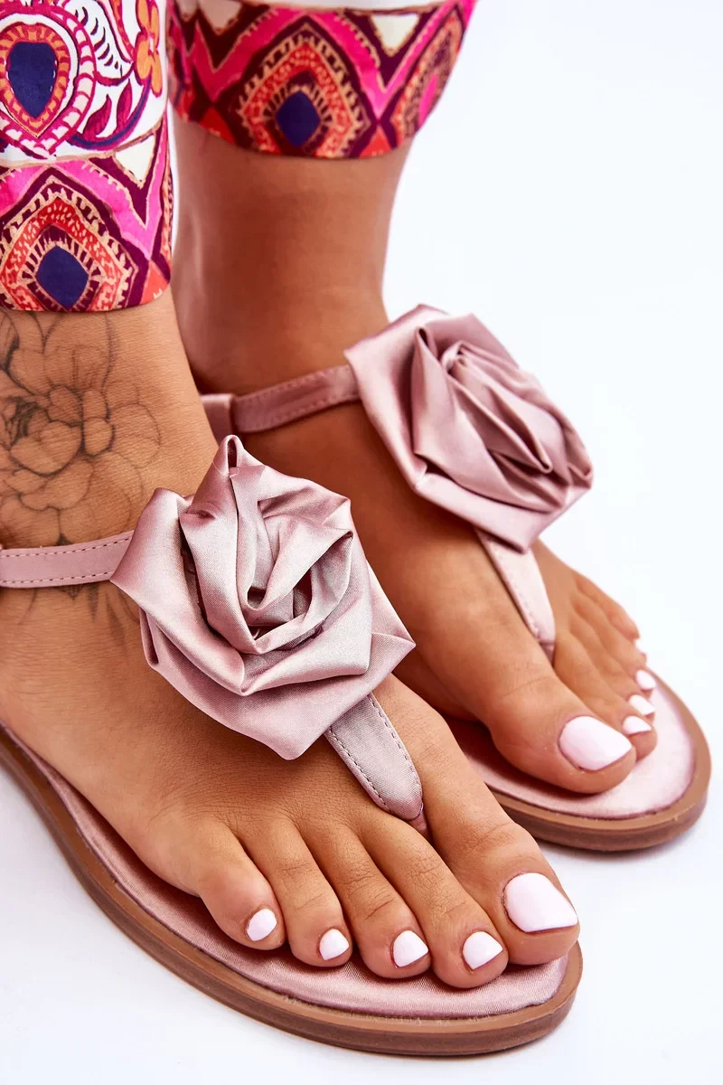 Dámské sandály jsou vyrobeny z textilního materiálu imitujícího satén. Zdobeno velkou, materiálovou růžicí uprostřed. Sandály ve stylu žabek na rovném podpatku. Zapínají se nastavitelným popruhem s přezkou. Měkká stélka je vyrobena z materiálu. Při výběru velikosti se řiďte tabulkou velikostí.