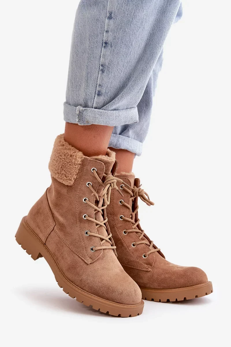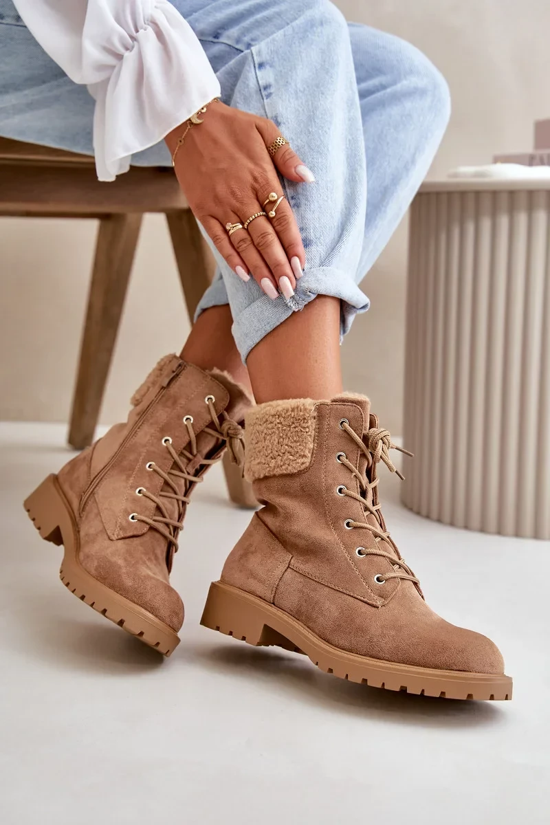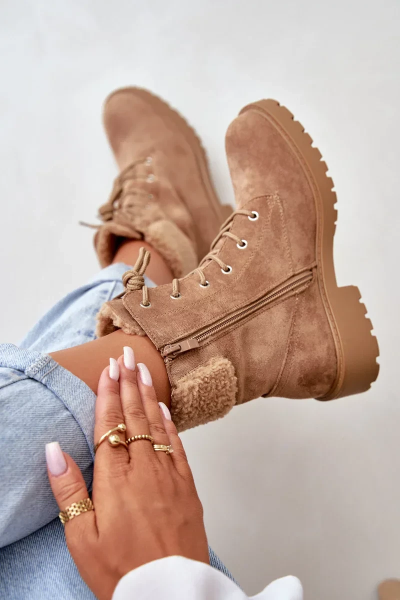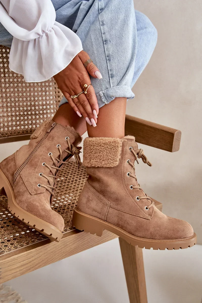 Dámské kotníkové boty vyrobené z měkkého eko semiše. Vnitřek zateplený obuvnickou dekou, což zajišťuje pohodlí v chladnějších dnech. Hora ozdobená stylovým kožíškem. Model šněrovací, s dodatečným zapínáním na zip, což usnadňuje obouvání a přizpůsobení noze. Ideální na podzimní a zimní procházky i každodenní stylizace. Při výběru velikosti se prosím řiďte tabulkou velikostí.