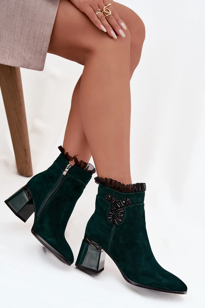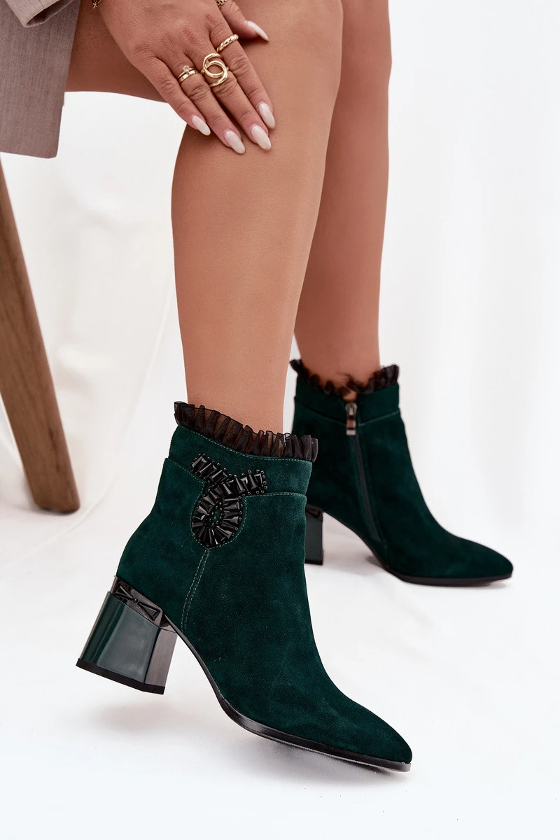 Boty jsou vyrobené z kvalitní přírodní semišové kůže, která je měkká, prodyšná a odolná. Stabilní sloupkový podpatek zajišťuje pohodlnou chůzi, zatímco zateplený vnitřek udržuje nohy v teple. Jemná ozdoba na svršku přidává botám elegantní akcent a podtrhuje jejich styl. Praktický boční zip usnadňuje obouvání a perfektně přizpůsobuje botu noze. Lahvově zelený odstín působí luxusně a snadno se kombinuje s různými outfity.