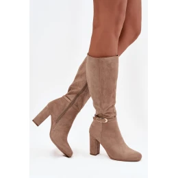 Dámské zateplené kozačky na sloupkovém podpatku se zlatou přezkou Seraphine – béžové