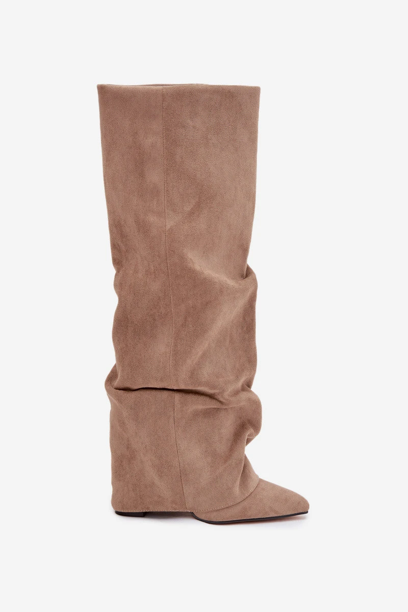 Dámské zateplené kozačky s vyhrnutou špičkou na sloupkovém podpatku Elivira – béžové