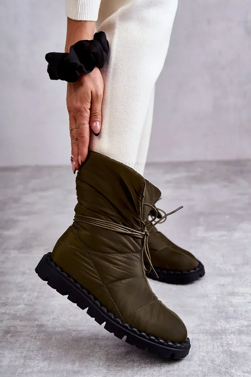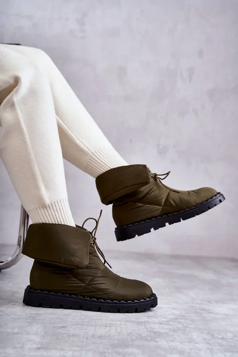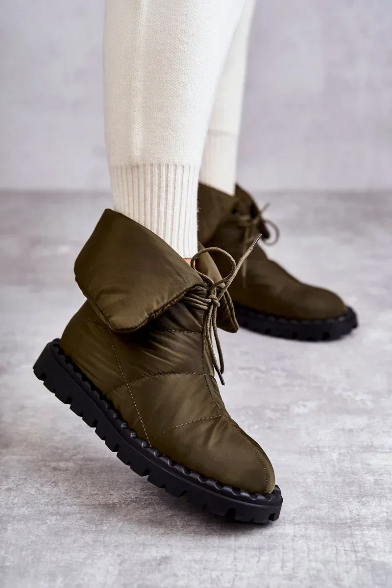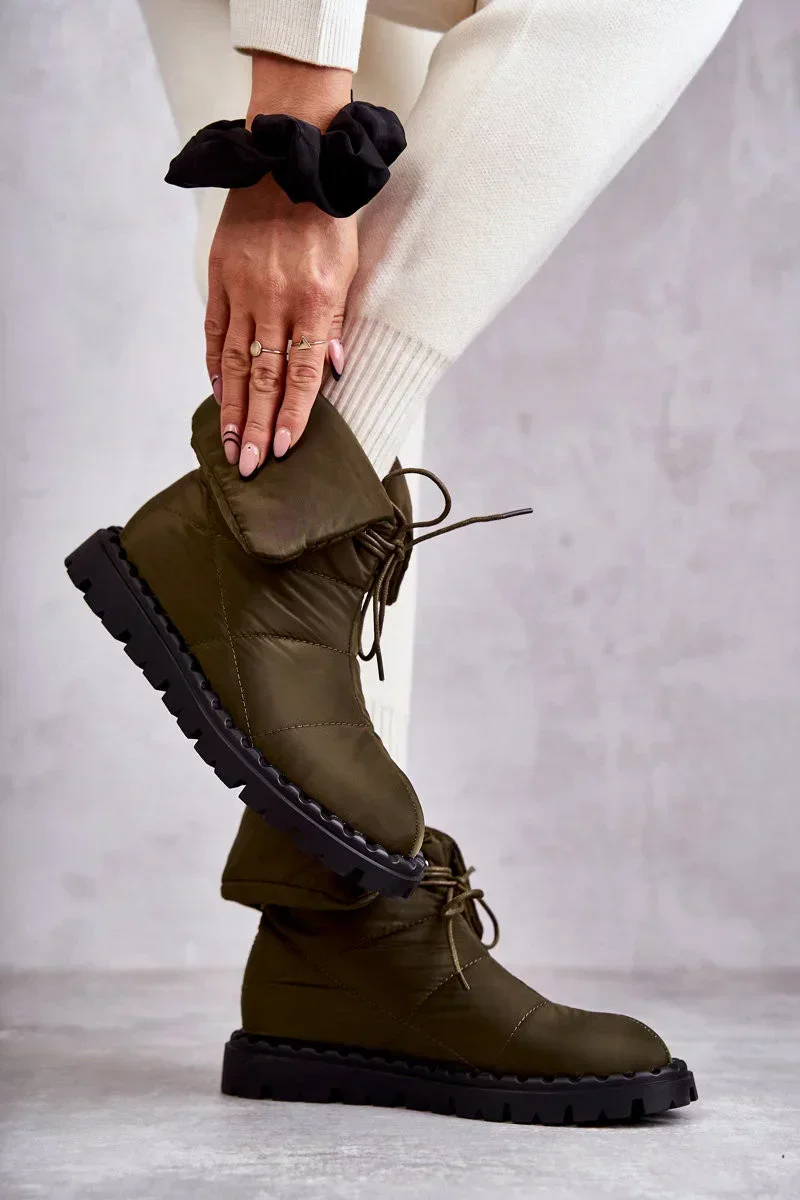 Dámské kozačky z textilního materiálu s prošíváním. Model s rolovacím kotníkovým svrškem. Tyto boty mají šněrování. Jsou namontovány na plošině s drážkami z pryžového materiálu. Navíc jsou protiskluzové. Uvnitř zateplená dekou na boty. Ideální pro chladné a větrné dny! Při výběru velikosti použijte tabulku velikostí.