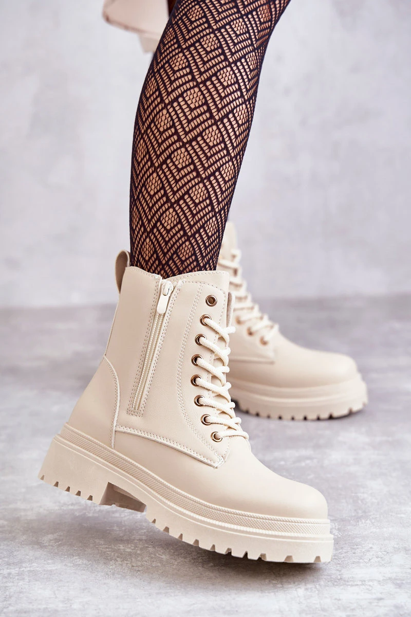 Krásné, dámské kozačky vyrobené z eko kůže. Mají pevné šněrování vpředu a zip, který usnadňuje obouvání bot na boční straně svršku. Nasazené na platformě a plochém podpatku s drážkami. Uvnitř byly izolovány přikrývkou na boty. Klasický střih, ideální pro mnoho stylů, který byste měli mít ve svém šatníku! Při výběru velikosti použijte tabulku velikostí.