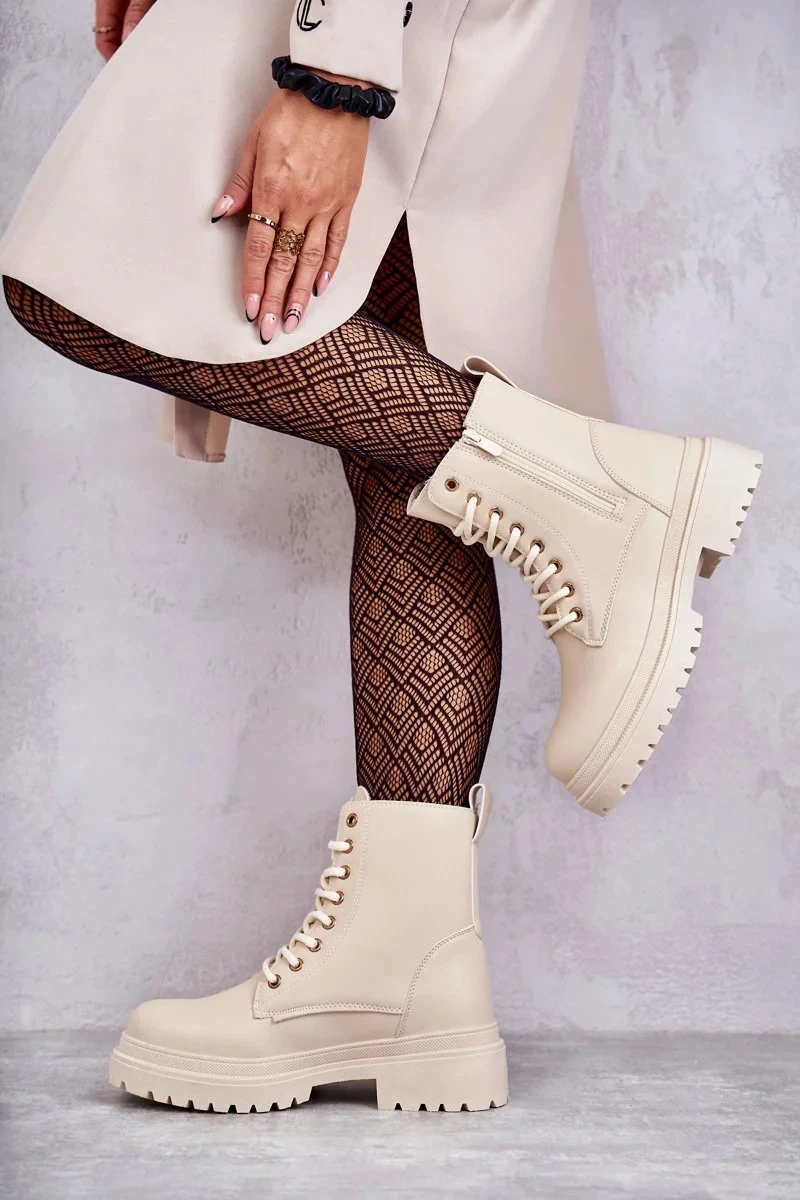 Krásné, dámské kozačky vyrobené z eko kůže. Mají pevné šněrování vpředu a zip, který usnadňuje obouvání bot na boční straně svršku. Nasazené na platformě a plochém podpatku s drážkami. Uvnitř byly izolovány přikrývkou na boty. Klasický střih, ideální pro mnoho stylů, který byste měli mít ve svém šatníku! Při výběru velikosti použijte tabulku velikostí.