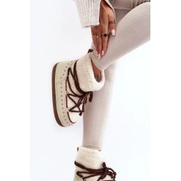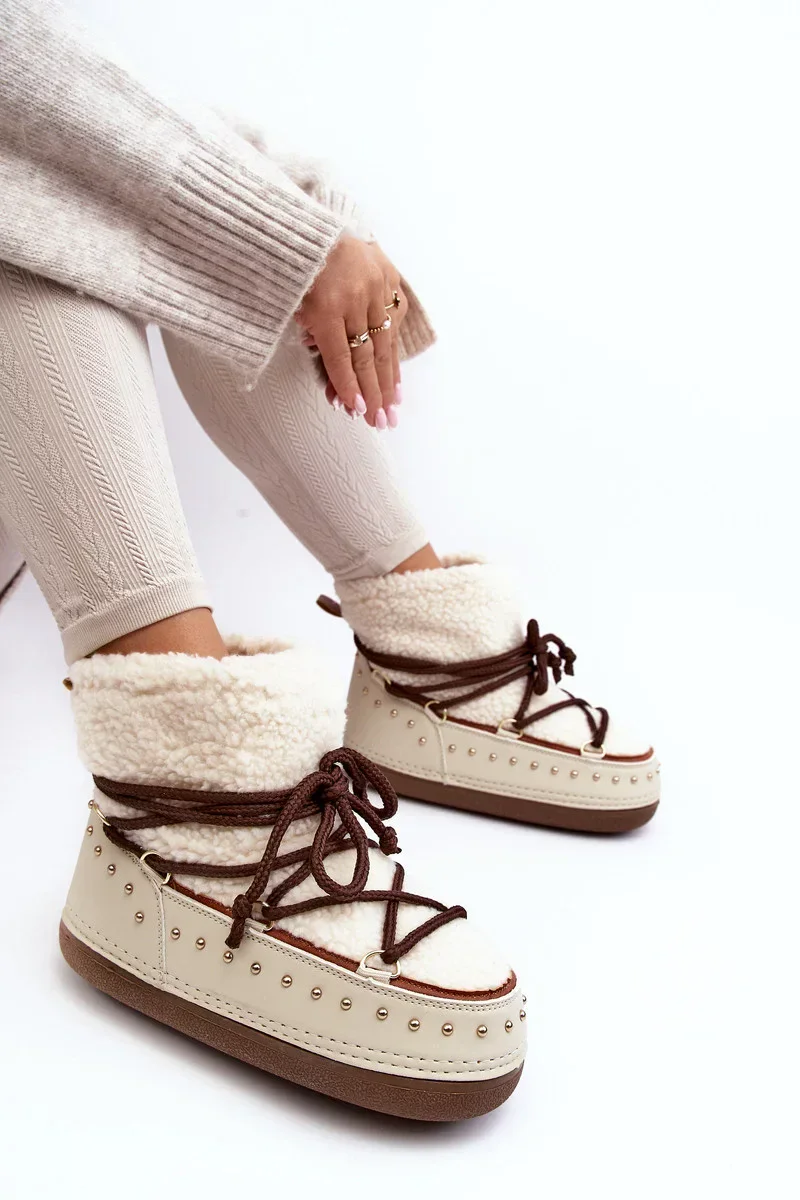 Jedinečné dámské sněhule jsou vyrobeny z chladu a větru odolného materiálu. Svršek s umělou ovčí kůží a cvočky je perfektní na podzimní a zimní období. Klasický nazouvací model s dodatečným šněrováním. Sněžnice byly namontovány na masivní platformě. Uvnitř mají izolaci v podobě pěny a deku na boty, které poskytují vysokou ochranu v chladných dnech. Při výběru velikosti se řiďte tabulkou velikostí.