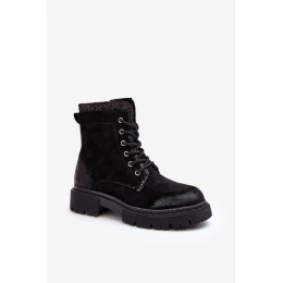 Boty dámské zdobené malými, lesklými šťastími. Umístěné na platformě a plochém podpatku. Zapínání na zip. Šněrování na přední straně. Špičky zaoblené. Střed oteplený kožešinou. Klasický model, který dokončí téměř každou podzimní-zimní stylizaci! Při výběru velikosti se řiďte tabulkou velikostí.