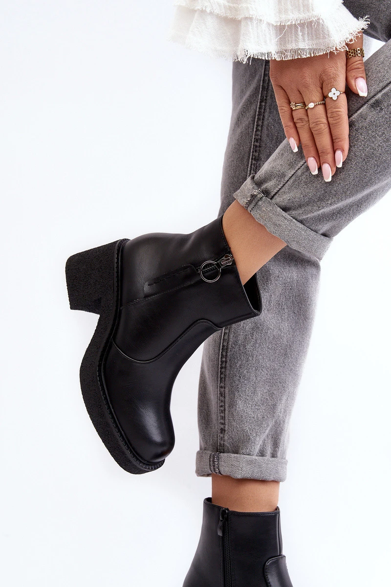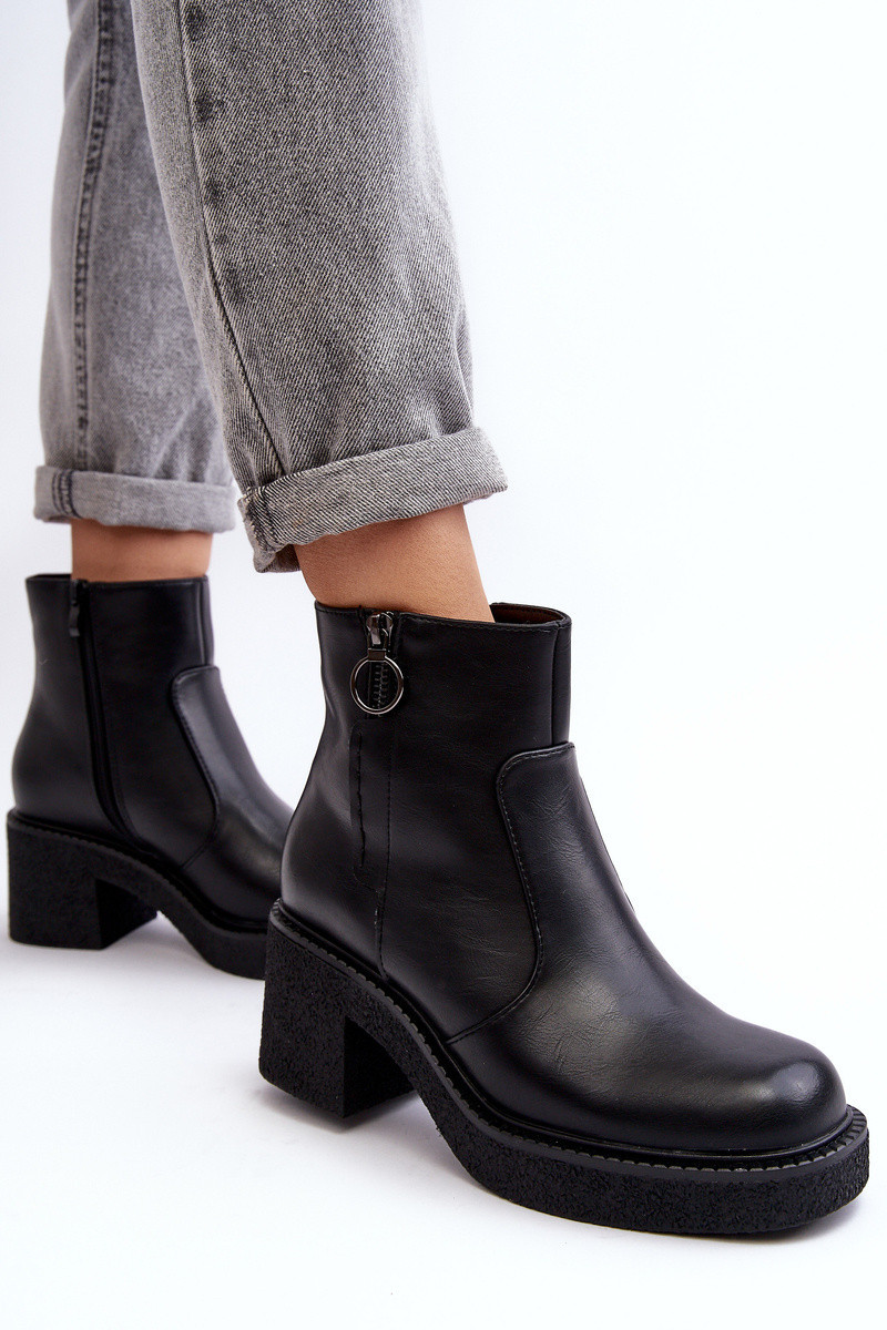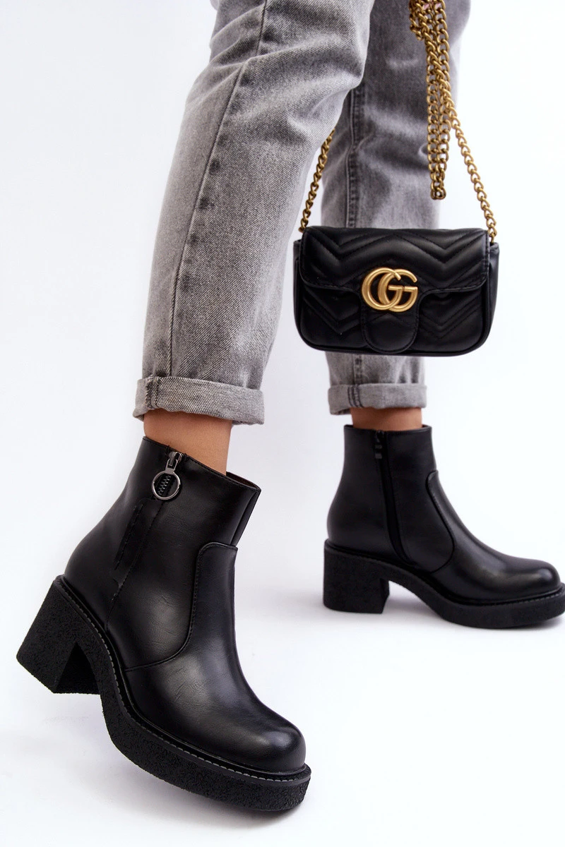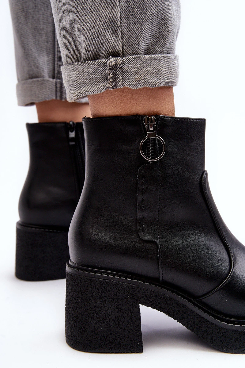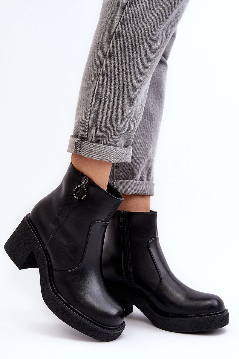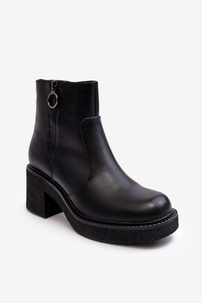 Boty dámské umístěné na masivním podpatku a platformě. Vyrobeno z eko kůže. Zapíná se na zip po straně. Střed oteplený příjemným na dotek kožešinou. Špičky zaoblené. Svršek ozdobený prošíváním a dalším, krátkým zipem. Patka je zesílená. Při výběru velikosti se řiďte tabulkou velikostí.