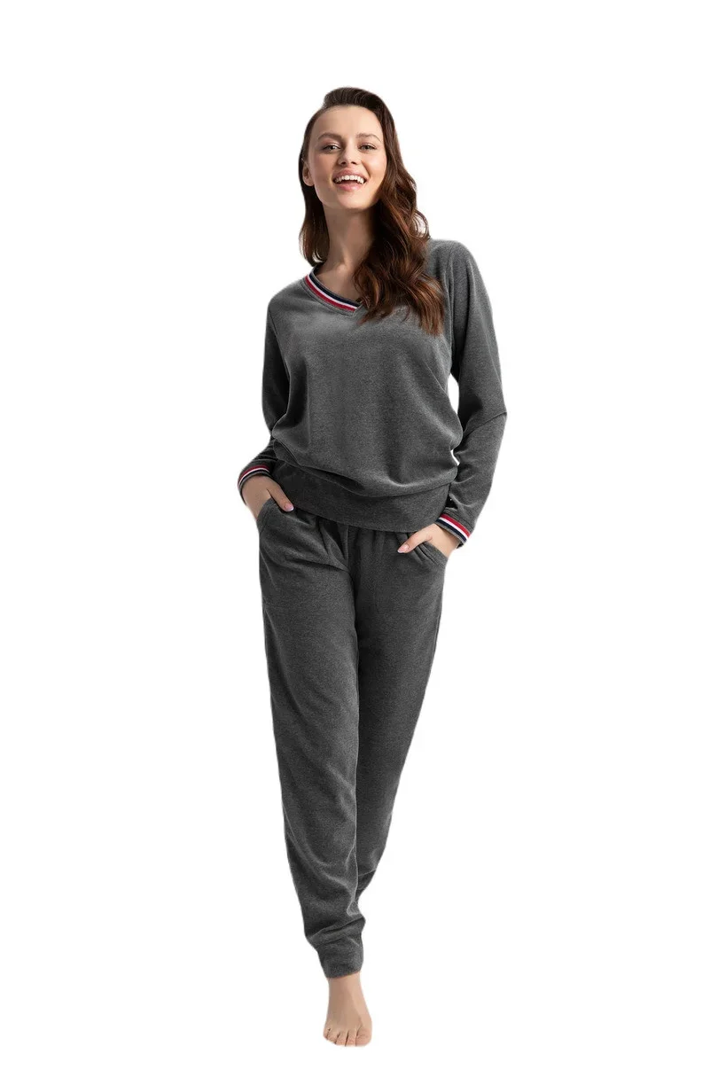Dámská tepláková souprava která se skládá z modrých kalhot s výstřihem do V a kalhot s kapsami. Výstřih a rukávy jsou zakončeny dvoubarevným řasením. Kalhoty jsou na spodním okraji jemně zúžené a rótaké zakončené žebrovaným velurovým záhybem.