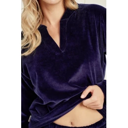 Dámská dvoudílná velurová tepláková souprava s dlouhými rukávy. Doplňují je dlouhé kalhoty s mírně zúženými nohavicemi.