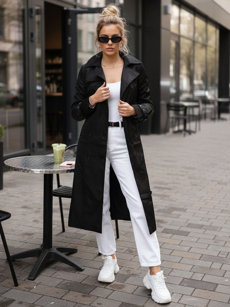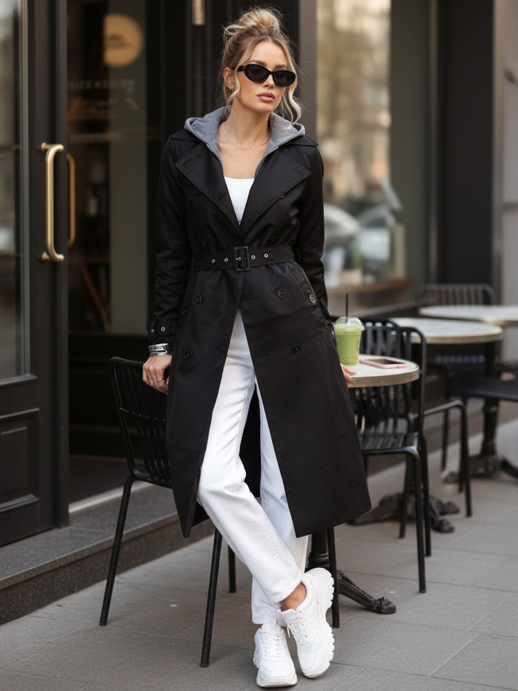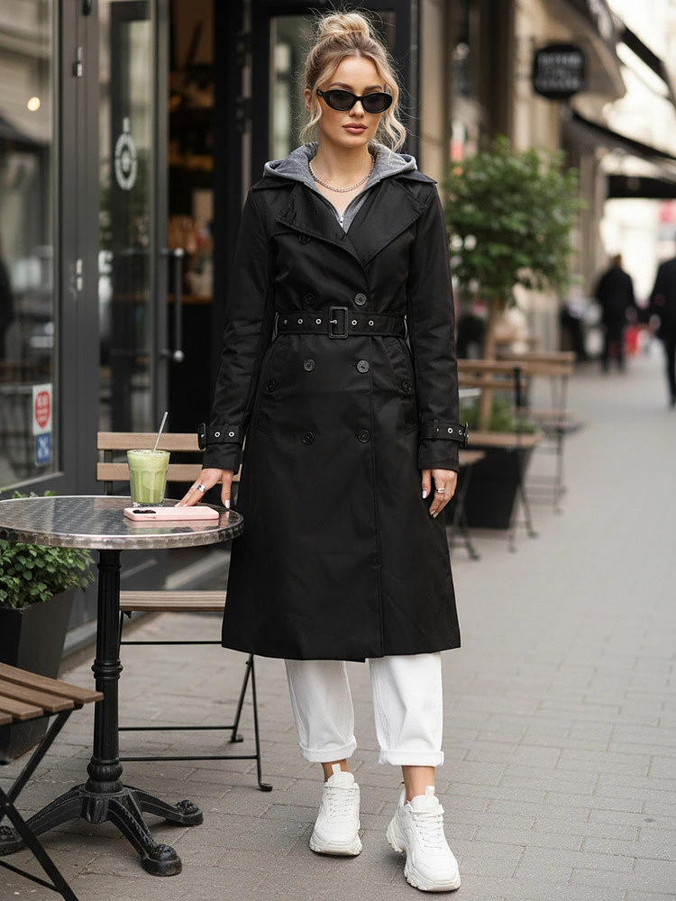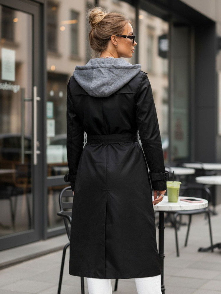 Trencz damski dwurzędowy z kapturem TY5654 czarny