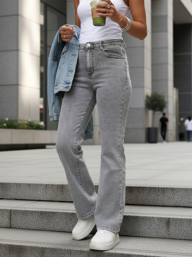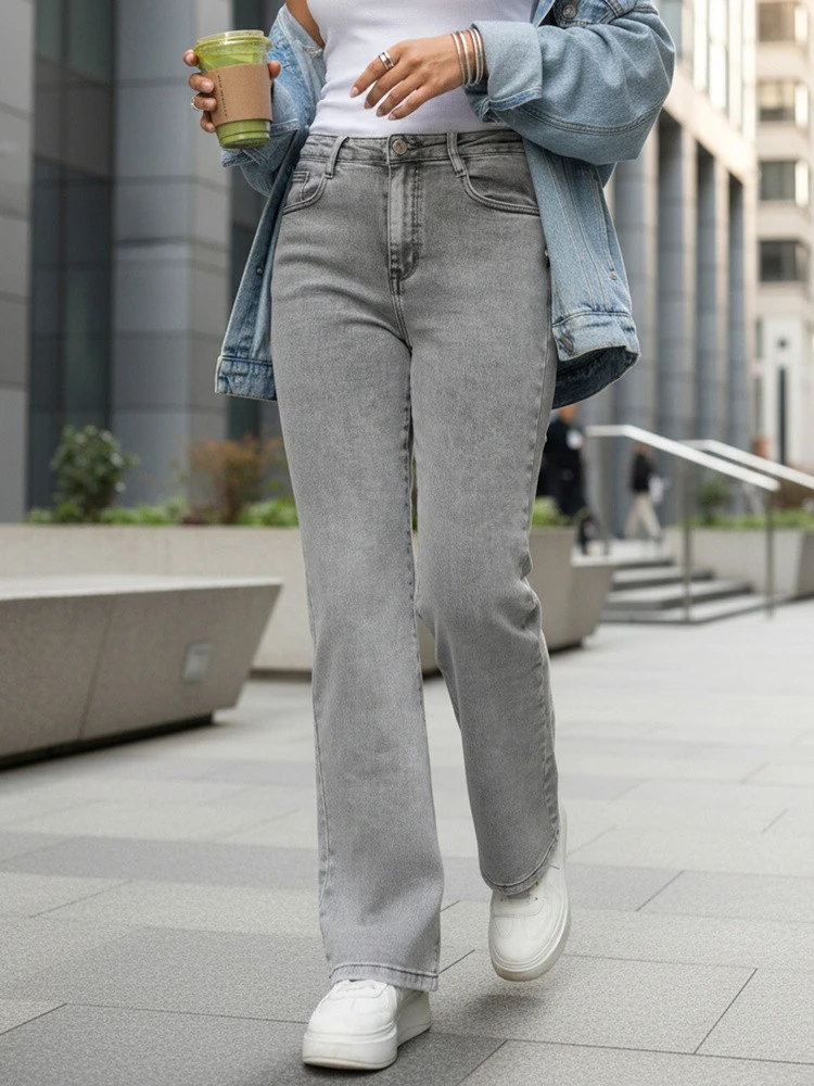 Nogawka ma prostą linię z delikatnym rozszerzeniem ku dołowi, dlatego jeansy dobrze łączą się zarówno ze sneakersami, jak i z botkami lub obcasami.