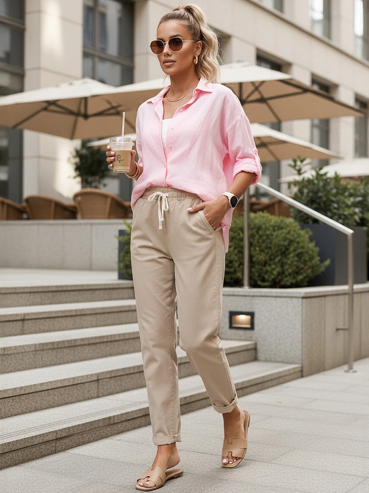 Luźniejszy krój w biodrach zapewnia swobodę podczas ruchu, a zwężana nogawka nadaje sylwetce proporcji. Spodnie sprawdzają się podczas spacerów, zakupów oraz codziennych aktywności.