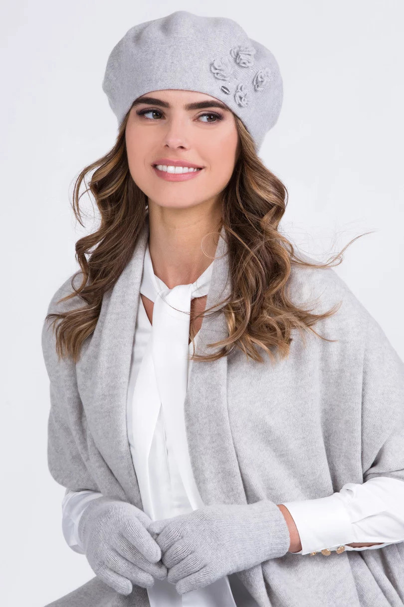 Baret je vyrobený z teplé vlněné příze a je ideálně vypasovaný. Na boku modelu je květinová aplikace. Baret je skvělou volbou pro chladné dny.