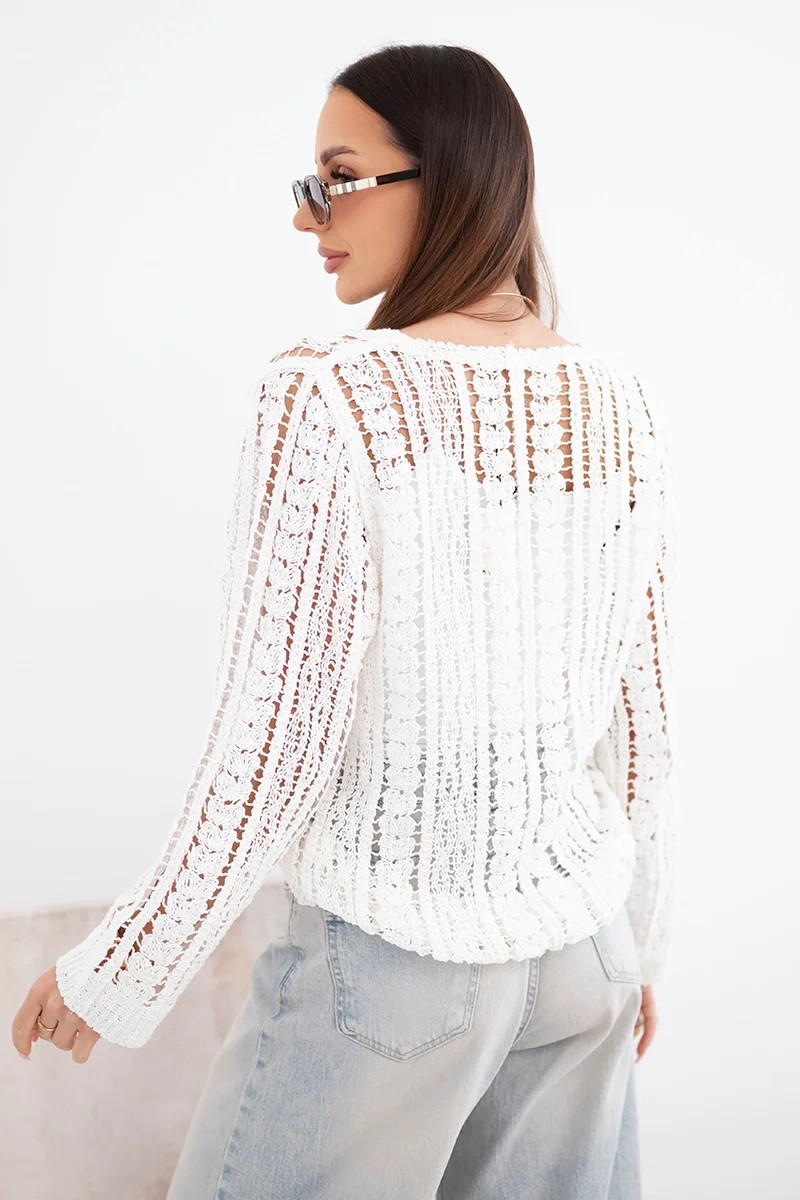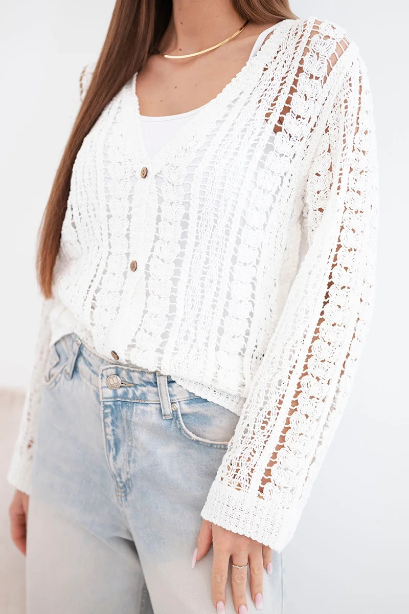 Dámský bavlněný ažurový svetr zapínaný na knoflíky s výstřihem do V bílý