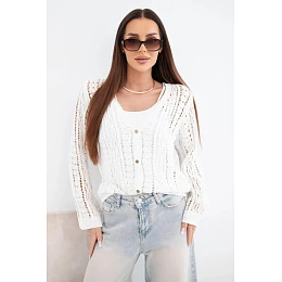 Dámský svetr zapínaný na knoflíky je nesmírně praktický a univerzální – lze jej nosit jak jako klasický svetr, tak jako lehký přehoz přes top nebo tričko. Dlouhý rukáv a jemně přiléhavý střih zajišťují pohodlí po celý den, bez ohledu na příležitost. Ažurová struktura materiálu zaručuje prodyšnost, díky čemuž je model ideální do přechodného období.