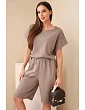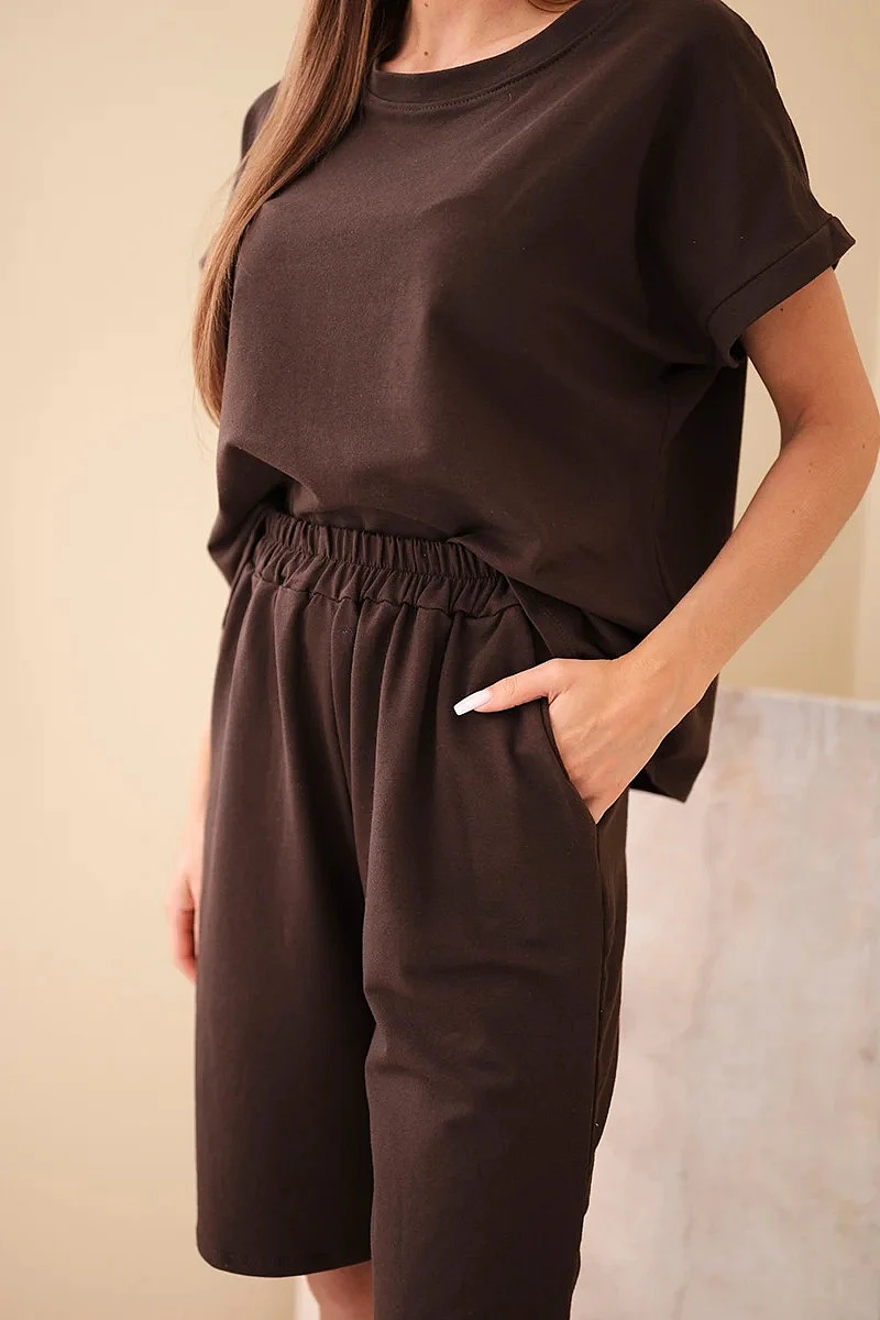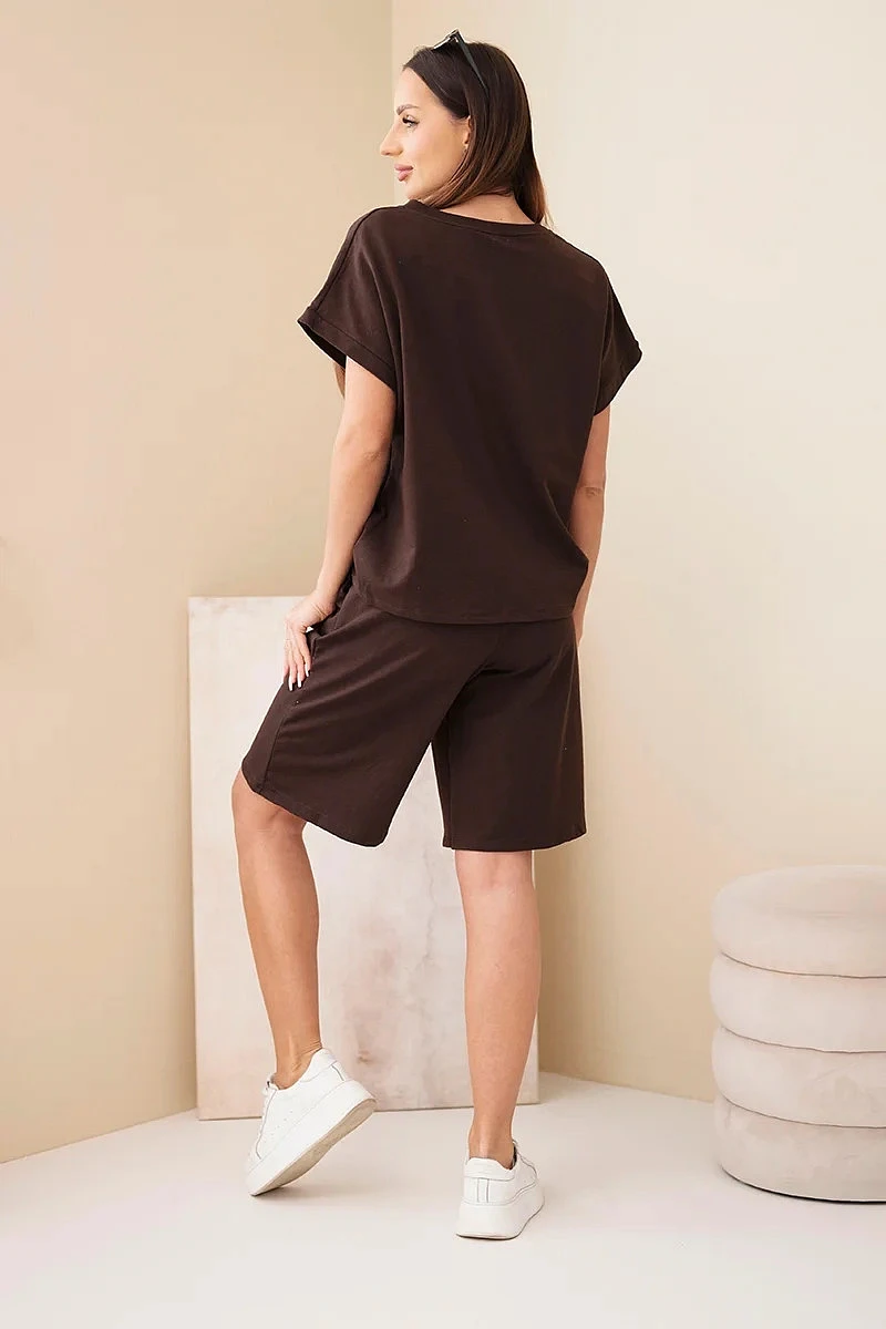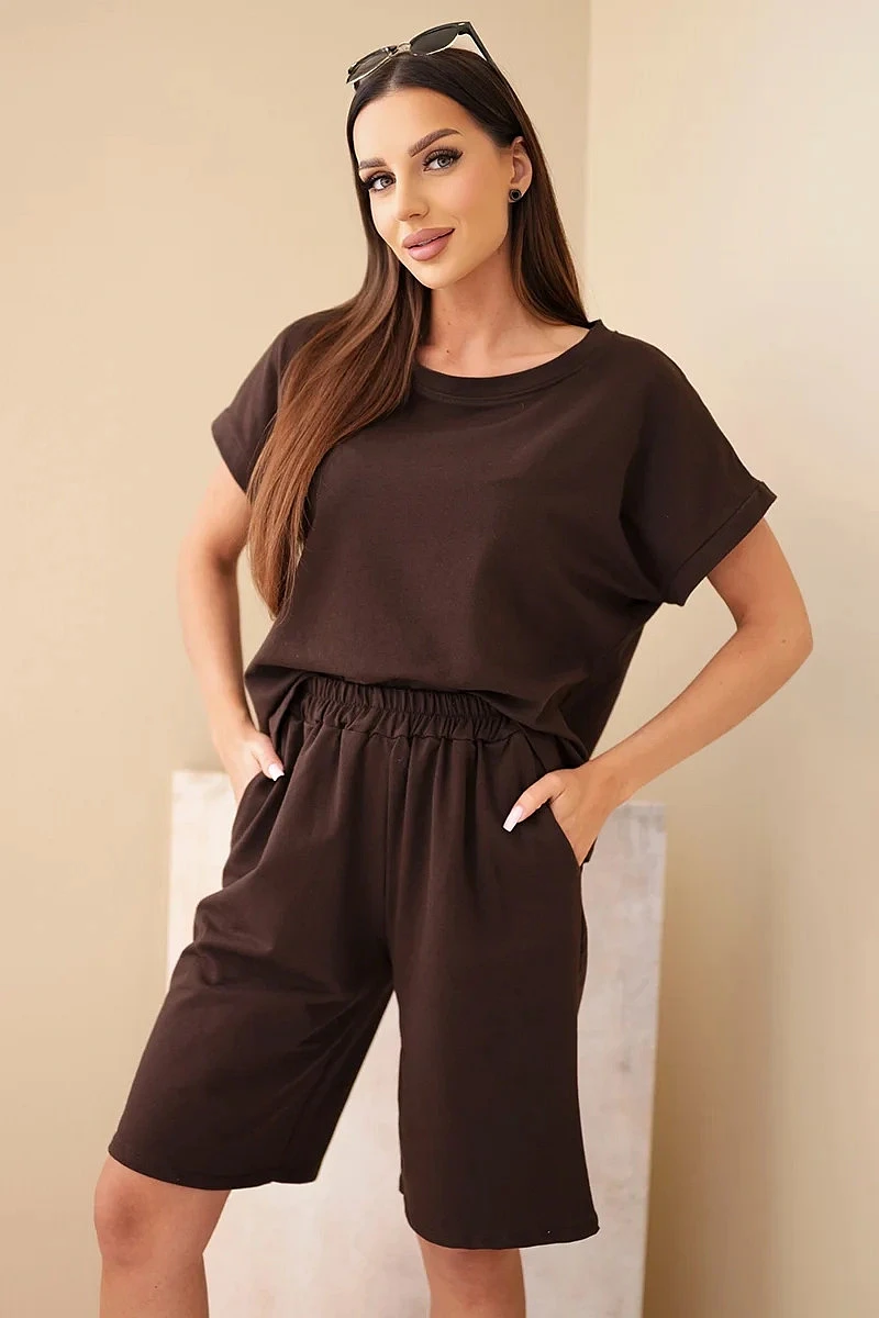 Dámský bavlněný komplet halenka krátký rukáv a kraťasy s gumičkou v pase hnědá