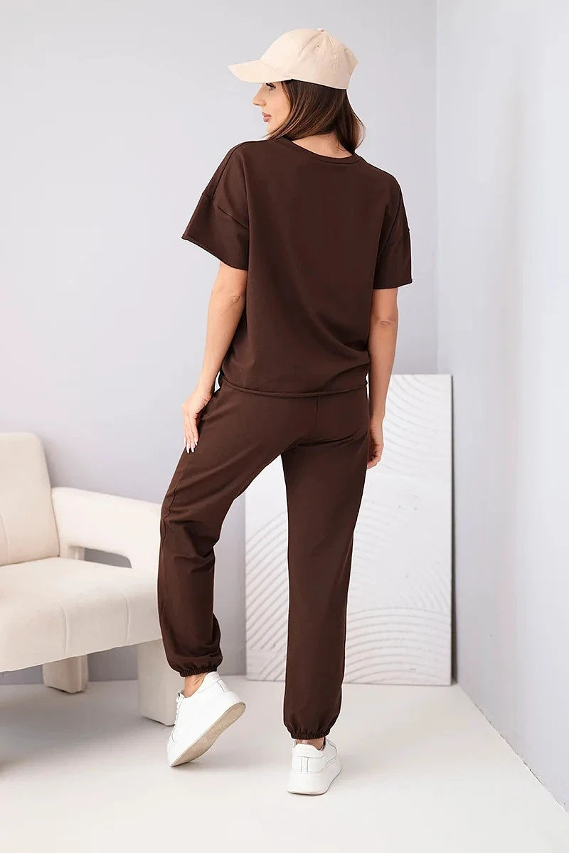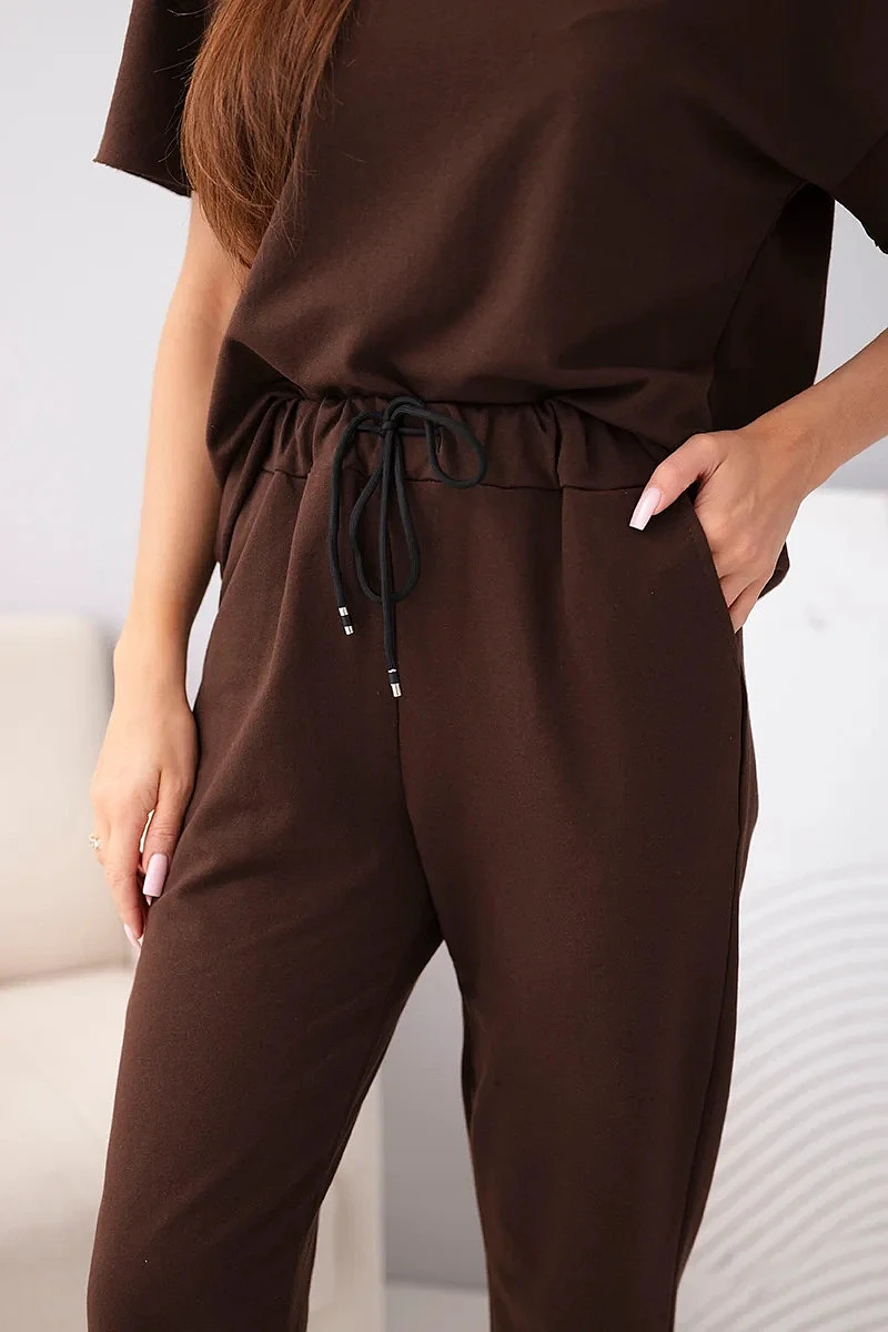 Dámský bavlněný komplet halenka s krátkým rukávem a teplákové kalhoty hnědý