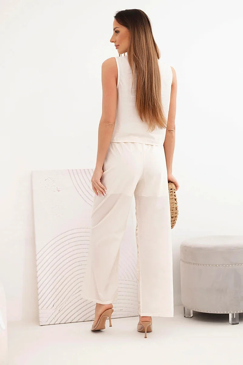 Komplet se skvěle hodí do letních stylizací – jak na každodenní nošení, pro prázdninové procházky, tak na setkání s přáteli. Přírodní bavlna zajišťuje prodyšnost a komfort nošení i v teplejších dnech. Kalhoty mají elastický pas, díky čemuž se dobře přizpůsobují postavě a zaručují pohodlí po celý den. Krátká vesta s výstřihem do V krásně zvýrazňuje postavu a skvěle se kombinuje se širokými kalhotami, čímž vytváří módní a harmonický celek. Italská výroba garantuje vysokou kvalitu provedení a módní styl inspirovaný italskými trendy.