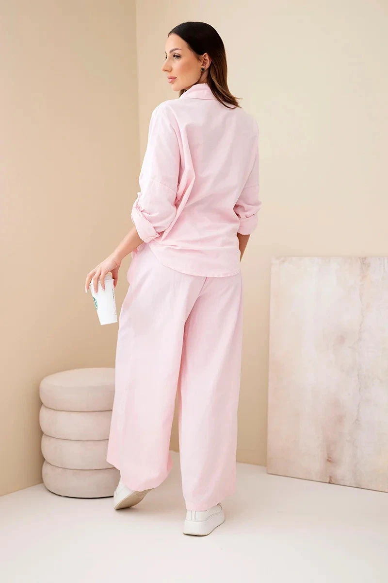 Dámský bavlněný komplet s košilí na zavazování a širokými nohavicemi pudrově růžová