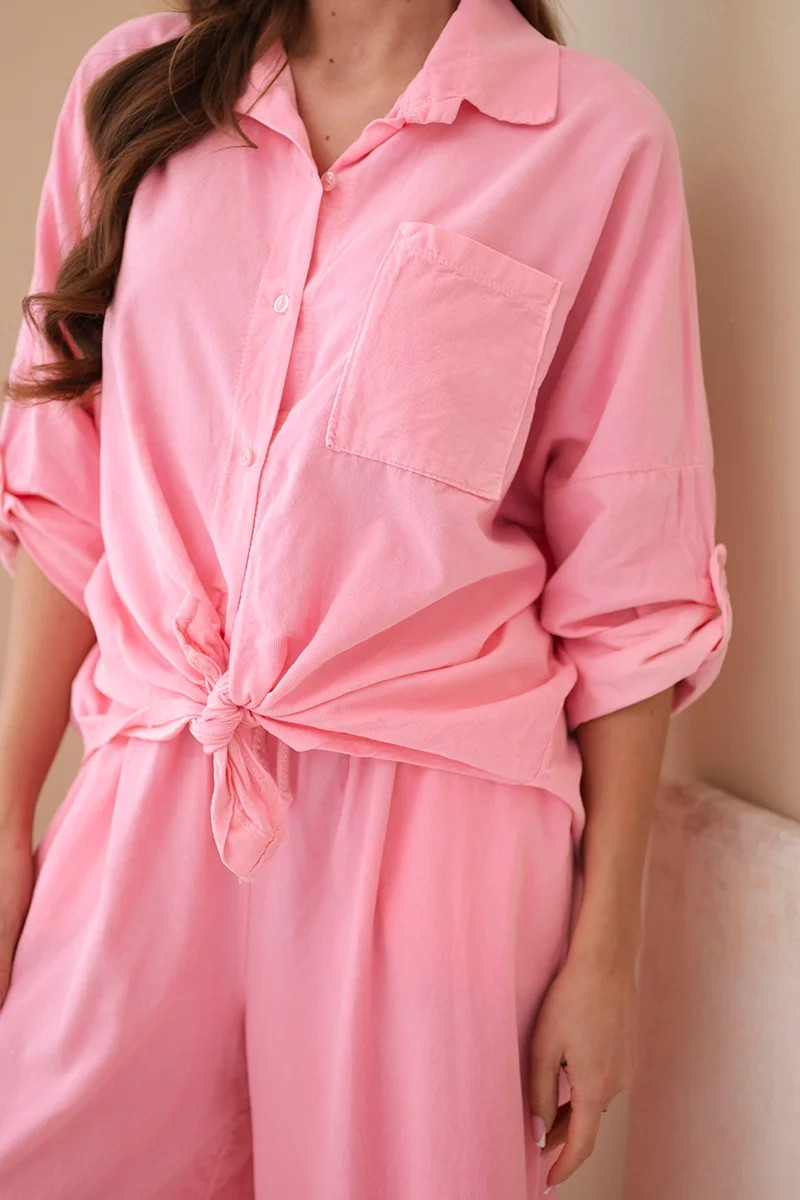 Dámský bavlněný komplet s košilí na zavazování a širokými nohavicemi světle růžová