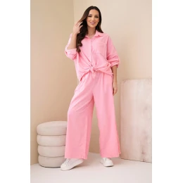 Dámský bavlněný komplet s košilí na zavazování a širokými nohavicemi světle růžová